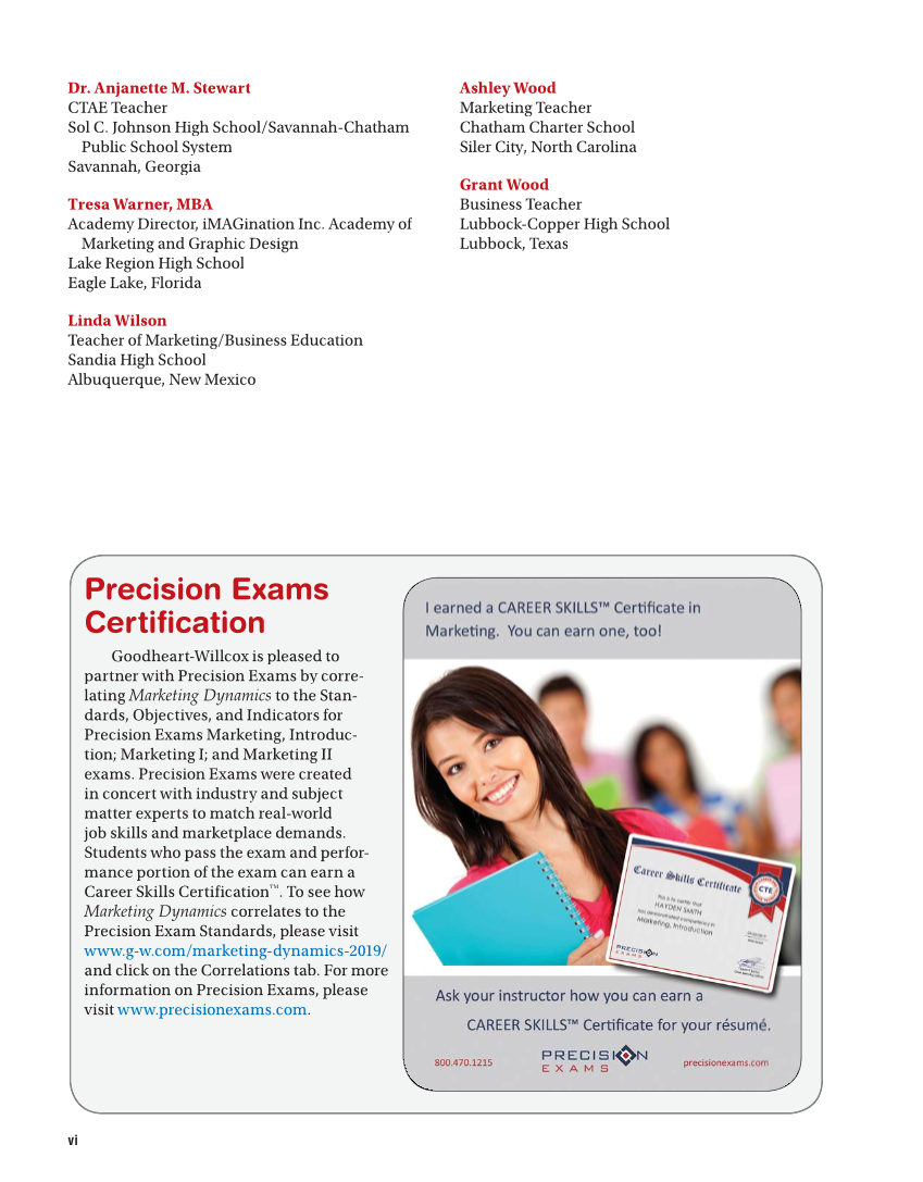 vi Dr. Anjanette M. Stewart CTAE Teacher Sol C. Johnson High School/Savannah-Chatham Public School System Savannah, Georgia Tresa Warner, MBA Academy Director, iMAGination Inc. Academy of Marketing and Graphic Design Lake Region High School Eagle Lake, Florida Linda Wilson Teacher of Marketing/Business Education Sandia High School Albuquerque, New Mexico Precision Exams Certifi cation Goodheart-Willcox is pleased to partner with Precision Exams by corre- lating Marketing Dynamics to the Stan- dards, Objectives, and Indicators for Precision Exams Marketing, Introduc- tion Marketing I and Marketing II exams. Precision Exams were created in concert with industry and subject matter experts to match real-world job skills and marketplace demands. Students who pass the exam and perfor- mance portion of the exam can earn a Career Skills Certification™. To see how Marketing Dynamics correlates to the Precision Exam Standards, please visit www.g-w.com/marketing-dynamics-2019/ and click on the Correlations tab. For more information on Precision Exams, please visit www.precisionexams.com. Ashley Wood Marketing Teacher Chatham Charter School Siler City, North Carolina Grant Wood Business Teacher Lubbock-Copper High School Lubbock, Texas