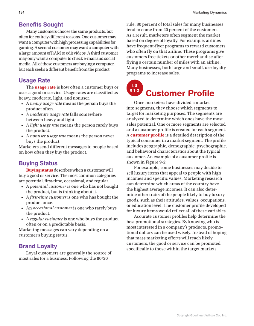 154 Marketing Dynamics Copyright Goodheart-Willcox Co., Inc. Benefits Sought Many customers choose the same products, but often for entirely different reasons. One customer may want a computer with high processing capabilities for gaming. A second customer may want a computer with a large amount of RAM to edit videos. A third customer may only want a computer to check e-mail and social media. All of these customers are buying a computer, but each seeks a different benefit from the product. Usage Rate The usage rate is how often a customer buys or uses a good or service. Usage rates are classified as heavy, moderate, light, and nonuser. • A heavy usage rate means the person buys the e product often. • A moderate usage rate falls somewhere e between heavy and light. • A light usage rate means the person rarely buys e the product. • A nonuser usage rate means the person never e buys the product. Marketers send different messages to people based on how often they buy the product. Buying Status Buying status describes when a customer will buy a good or service. The most common categories are potential, first-time, occasional, and regular. • A potential customer is one who has not bought r the product, but is thinking about it. • A first-time customer is one who has bought the r product once. • An occasional customer is one who rarely buys r the product. • A regular customer is one who buys the product r often or on a predictable basis. Marketing messages can vary depending on a customer’s buying status. Brand Loyalty Loyal customers are generally the source of most sales for a business. Following the 80/20 rule, 80 percent of total sales for many businesses tend to come from 20 percent of the customers. As a result, marketers often segment the market based on degree of loyalty. For example, airlines have frequent-flyer programs to reward customers who often fly on that airline. These programs give customers free tickets or other merchandise after flying a certain number of miles with an airline. Many businesses, both large and small, use loyalty programs to increase sales. LO 9.1-3 Customer Profi le Once marketers have divided a market into segments, they choose which segments to target for marketing purposes. The segments are analyzed to determine which ones have the most sales potential. One or more segments are selected and a customer profile is created for each segment. A customer profile is a detailed description of the typical consumer in a market segment. The profile includes geographic, demographic, psychographic, and behavioral characteristics about the typical customer. An example of a customer profile is shown in Figure 9-2. For example, some businesses may decide to sell luxury items that appeal to people with high incomes and specific values. Marketing research can determine which areas of the country have the highest average incomes. It can also deter- mine other traits of the people likely to buy luxury goods, such as their attitudes, values, occupations, or education level. The customer profile developed for luxury items would reflect all of these variables. Accurate customer profiles help determine the best promotional strategies. By knowing who is most interested in a company’s products, promo- tional dollars can be used wisely. Instead of hoping that mass marketing efforts will reach likely customers, the good or service can be promoted specifically to those within the target markets.