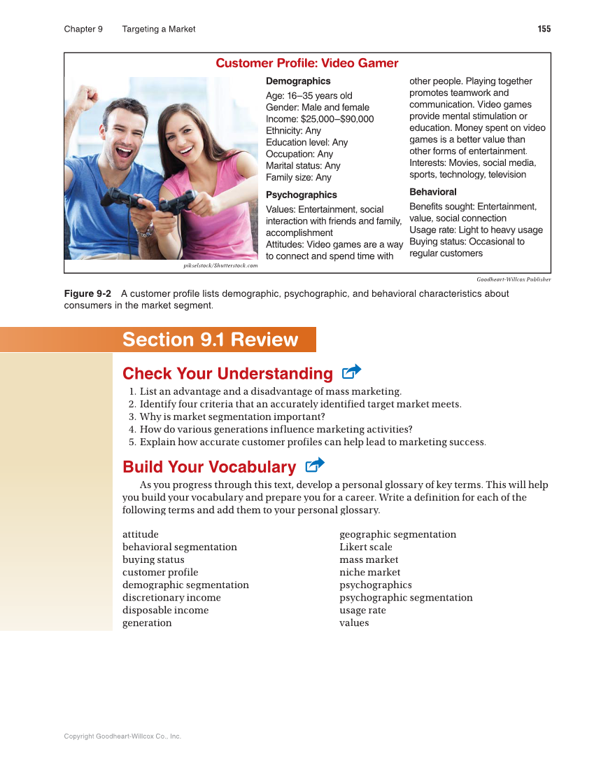 Chapter 9 Targeting a Market 155 Copyright Goodheart-Willcox Co., Inc. Demographics Age: 16–35 years old Gender: Male and female Income: $25,000–$90,000 Ethnicity: Any Education level: Any Occupation: Any Marital status: Any Family size: Any Psychographics Values: Entertainment, social interaction with friends and family, accomplishment Attitudes: Video games are a way to connect and spend time with other people. Playing together promotes teamwork and communication. Video games provide mental stimulation or education. Money spent on video games is a better value than other forms of entertainment. Interests: Movies, social media, sports, technology, television Behavioral Benefits sought: Entertainment, value, social connection Usage rate: Light to heavy usage Buying status: Occasional to regular customers Customer Profile: Video Gamer Goodheart-Willcox Publisher Figure 9-2 A customer profile lists demographic, psychographic, and behavioral characteristics about consumers in the market segment. Section 9.1 Review Check Your Understanding 1. List an advantage and a disadvantage of mass marketing. 2. Identify four criteria that an accurately identified target market meets. 3. Why is market segmentation important? 4. How do various generations influence marketing activities? 5. Explain how accurate customer profiles can help lead to marketing success. Build Your Vocabulary As you progress through this text, develop a personal glossary of key terms. This will help you build your vocabulary and prepare you for a career. Write a definition for each of the following terms and add them to your personal glossary. attitude behavioral segmentation buying status customer profile demographic segmentation discretionary income disposable income generation geographic segmentation Likert scale mass market niche market psychographics psychographic segmentation usage rate values pikselstock/Shutterstock.com