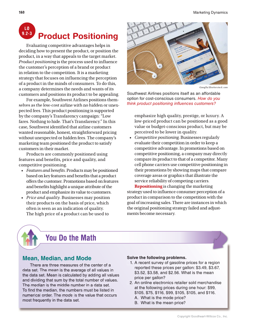 160 Marketing Dynamics Copyright Goodheart-Willcox Co., Inc. LO 9.2-3 Product Positioning Evaluating competitive advantages helps in deciding how to present the product, or position the product, in a way that appeals to the target market. Product positioning is the process used to influence g the customer’s perception of a brand or product in relation to the competition. It is a marketing strategy that focuses on influencing the perception of a product in the minds of consumers. To do this, a company determines the needs and wants of its customers and positions its product to be appealing. For example, Southwest Airlines positions them- selves as the low-cost airline with no hidden or unex- pected fees. This product positioning is supported by the company’s Transfarency campaign: “Low fares. Nothing to hide. That’s Transfarency.” In this case, Southwest identified that airline customers wanted reasonable, honest, straightforward pricing without unexpected or hidden fees. The company’s marketing team positioned the product to satisfy customers in their market. Products are commonly positioned using features and benefits, price and quality, and competitive positioning. • Features and benefits. Products may be positioned based on key features and benefits that a product offers the customer. Promotions based on features and benefits highlight a unique attribute of the product and emphasize its value to customers. • Price and quality. Businesses may position their products on the basis of price, which often is seen as an indication of quality. The high price of a product can be used to emphasize high quality, prestige, or luxury. A low-priced product can be positioned as a good value or budget-conscious product, but may be perceived to be lower in quality. • Competitive positioning. Businesses regularly evaluate their competition in order to keep a competitive advantage. In promotions based on competitive positioning, a company may directly compare its product to that of a competitor. Many cell phone carriers use competitive positioning in their promotions by showing maps that compare coverage areas or graphics that illustrate the service reliability of competing carriers. Repositioning is changing the marketing g strategy used to influence consumer perception of a product in comparison to the competition with the goal of increasing sales. There are instances in which the original positioning strategy failed and adjust- ments become necessary. GongTo/Shutterstock.com Southwest Airlines positions itself as an affordable option for cost-conscious consumers. How do you think product positioning influences customers? Mean, Median, and Mode There are three measures of the center of a data set. The h mean is the average of all values in the data set. M an is calculated by adding a all values and dividing that a sum by the total number of values. The median is the middle number in a data set. To find the median, the t numbers must be listed in numerical order. The mode is the value tha occurs most frequently in the data set. Solve o the following problems. 1. A recent survey of gasoline prices for a region reported p these es prices per gallon: $3.49, $3.67, $3.52, $3.58, and a $2.56. What is the mean price per p gallon?n 2. An online electronics n retailer sold merchandise at the following prices during one hour: $99, $105, $75, $116, $99, 9 $105, $105, and $116. A. What is the mode price? B. What is the e mean price? You Do the Math