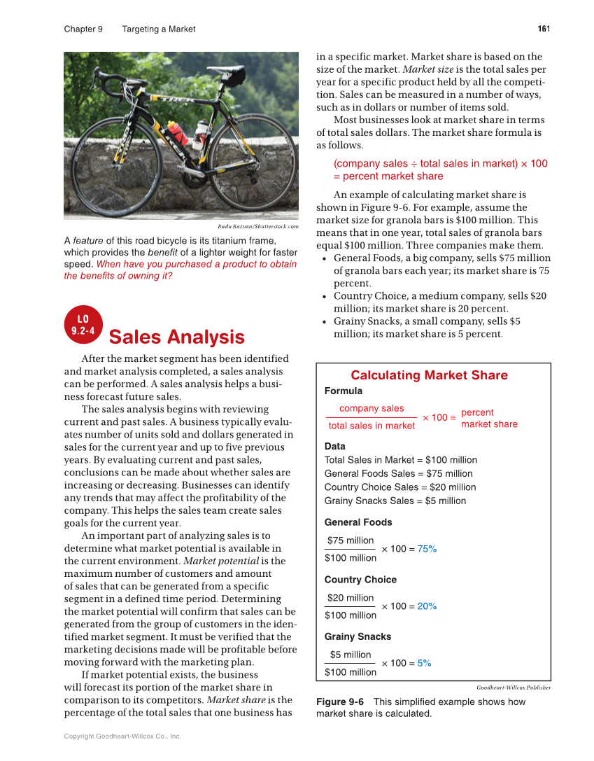 Chapter 9 Targeting a Market 161 Copyright Goodheart-Willcox Co., Inc. LO 9.2-4 Sales Analysis After the market segment has been identified and market analysis completed, a sales analysis can be performed. A sales analysis helps a busi- ness forecast future sales. The sales analysis begins with reviewing current and past sales. A business typically evalu- ates number of units sold and dollars generated in sales for the current year and up to five previous years. By evaluating current and past sales, conclusions can be made about whether sales are increasing or decreasing. Businesses can identify any trends that may affect the profitability of the company. This helps the sales team create sales goals for the current year. An important part of analyzing sales is to determine what market potential is available in the current environment. Market potential is the l maximum number of customers and amount of sales that can be generated from a specific segment in a defined time period. Determining the market potential will confirm that sales can be generated from the group of customers in the iden- tified market segment. It must be verified that the marketing decisions made will be profitable before moving forward with the marketing plan. If market potential exists, the business will forecast its portion of the market share in comparison to its competitors. Market share is the e percentage of the total sales that one business has in a specific market. Market share is based on the size of the market. Market size is the total sales per e year for a specific product held by all the competi- tion. Sales can be measured in a number of ways, such as in dollars or number of items sold. Most businesses look at market share in terms of total sales dollars. The market share formula is as follows. (company sales ÷ total sales in market) × 100 = percent market share An example of calculating market share is shown in Figure 9-6. For example, assume the market size for granola bars is $100 million. This means that in one year, total sales of granola bars equal $100 million. Three companies make them. • General Foods, a big company, sells $75 million of granola bars each year its market share is 75 percent. • Country Choice, a medium company, sells $20 million its market share is 20 percent. • Grainy Snacks, a small company, sells $5 million its market share is 5 percent. Radu Razvan/Shutterstock.com A feature of this road bicycle is its titanium frame, which provides the benefit of a lighter weight for faster speed. When have you purchased a product to obtain the benefits of owning it? Goodheart-Willcox Publisher Figure 9-6 This simplified example shows how market share is calculated. Calculating Market Share Data Total Sales in Market = $100 million General Foods Sales = $75 million Country Choice Sales = $20 million Grainy Snacks Sales = $5 million General Foods Formula company sales total sales in market × 100 = percent market share $75 million $100 million × 100 = 75% Country Choice $20 million $100 million × 100 = 20% Grainy Snacks $5 million $100 million × 100 = 5%