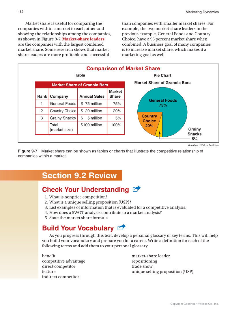 162 Marketing Dynamics Copyright Goodheart-Willcox Co., Inc. Market share is useful for comparing the companies within a market to each other and showing the relationships among the companies, as shown in Figure 9-7. Market-share leaders are the companies with the largest combined market share. Some research shows that market- share leaders are more profitable and successful than companies with smaller market shares. For example, the two market-share leaders in the previous example, General Foods and Country Choice, have a 95 percent market share when combined. A business goal of many companies is to increase market share, which makes it a marketing goal as well. Goodheart-Willcox Publisher Figure 9-7 Market share can be shown as tables or charts that illustrate the competitive relationship of companies within a market. Comparison of Market Share Pie Chart Market Share of Granola Bars Market Rank Company Annual Sales Share 1 General Foods $ 75 million 75% 2 Country Choice $ 20 million 20% 3 Grainy Snacks $ 5 million 5% Total $100 million 100% (market size) Table Market Share of Granola Bars General Foods 75% Country Choice 20% Grainy Snacks 5% Section 9.2 Review Check Your Understanding 1. What is nonprice competition? 2. What is a unique selling proposition (USP)? 3. List examples of information that is evaluated for a competitive analysis. 4. How does a SWOT analysis contribute to a market analysis? 5. State the market share formula. Build Your Vocabulary As you progress through this text, develop a personal glossary of key terms. This will help you build your vocabulary and prepare you for a career. Write a definition for each of the following terms and add them to your personal glossary. benefit competitive advantage direct competitor feature indirect competitor market-share leader repositioning trade show unique selling proposition (USP)