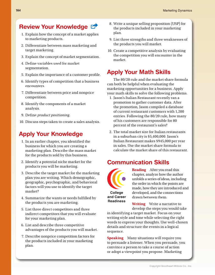 164 Marketing Dynamics Copyright Goodheart-Willcox Co., Inc. Review Your Knowledge 1. Explain how the concept of a market applies to marketing products. 2. Differentiate between mass marketing and target marketing. 3. Explain the concept of market segmentation. 4. Define variables used for market segmentation. 5. Explain the importance of a customer profile. 6. Identify types of competition that a business encounters. 7. Differentiate between price and nonprice competition. 8. Identify the components of a market analysis. 9. Define product positioning. g 10. Discuss steps taken to create a sales analysis. Apply Your Knowledge 1. In an earlier chapter, you identified the business for which you are creating a marketing plan. Describe the mass market for the products sold by this business. 2. Identify a potential niche market for the products you will be marketing. 3. Describe the target market for the marketing plan you are writing. Which demographic, geographic, psychographic, and behavioral factors will you use to identify the target market? 4. Summarize the wants or needs fulfilled by the products you are marketing. 5. List three direct competitors and three indirect competitors that you will evaluate for your marketing plan. 6. List and describe three competitive advantages of the products you will market. 7. Describe nonprice competition factors for the products included in your marketing plan. 8. Write a unique selling proposition (USP) for the products included in your marketing plan. 9. List three strengths and three weaknesses of the products you will market. 10. Create a competitive analysis by evaluating the competition you will encounter in the market. Apply Your Math Skills The 80/20 rule and the market share formula can both be helpful when evaluating the marketing opportunities for a business. Apply your math skills to solve the following problems. 1. Jason’s Italian Restaurant recently ran a promotion to gather customer data. After the promotion, Jason compiled a database of current restaurant customers with 1,200 entries. Following the 80/20 rule, how many of his customers are responsible for 80 percent of the restaurant’s sales? 2. The total market size for Italian restaurants in a suburban city is $5,400,000. Jason’s Italian Restaurant makes $945,000 per year in sales. Use the market share formula to calculate the market share of this restaurant. Communication Skills Reading After you read this chapter, analyze how the author unfolds a series of ideas, including the order in which the points are made, how they are introduced and developed, and the connections drawn between them. Writing Write a narrative to develop the steps you would take in identifying a target market. Focus on your writing style and tone while selecting the right words to express your thoughts. Use well-chosen details and structure the events in a logical sequence. Speaking Many situations will require you to persuade a listener. When you persuade, you convince a person to take a course of action or adopt a viewpoint you propose. Marketing College and Career Readiness