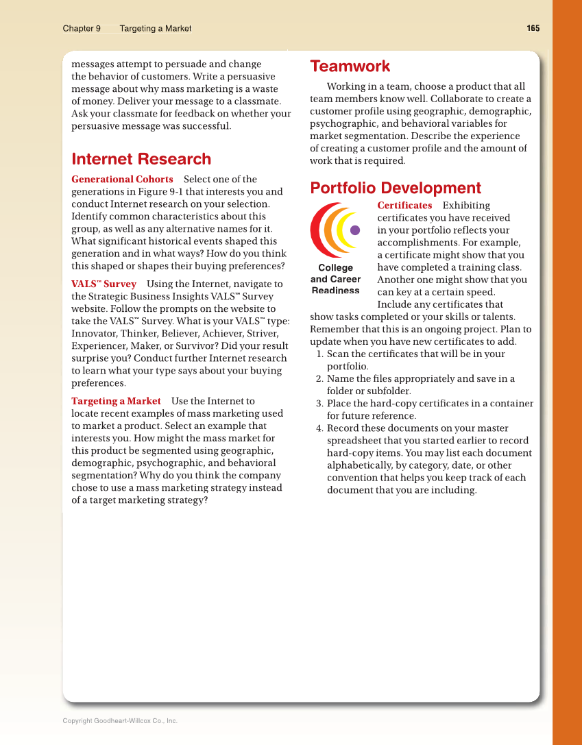 Chapter 9 Targeting a Market 165 Copyright Goodheart-Willcox Co., Inc. messages attempt to persuade and change the behavior of customers. Write a persuasive message about why mass marketing is a waste of money. Deliver your message to a classmate. Ask your classmate for feedback on whether your persuasive message was successful. Internet Research Generational Cohorts Select one of the generations in Figure 9-1 that interests you and conduct Internet research on your selection. Identify common characteristics about this group, as well as any alternative names for it. What significant historical events shaped this generation and in what ways? How do you think this shaped or shapes their buying preferences? VALS™ Survey Using the Internet, navigate to the Strategic Business Insights VALS™ Survey website. Follow the prompts on the website to take the VALS™ Survey. What is your VALS™ type: Innovator, Thinker, Believer, Achiever, Striver, Experiencer, Maker, or Survivor? Did your result surprise you? Conduct further Internet research to learn what your type says about your buying preferences. Targeting a Market Use the Internet to locate recent examples of mass marketing used to market a product. Select an example that interests you. How might the mass market for this product be segmented using geographic, demographic, psychographic, and behavioral segmentation? Why do you think the company chose to use a mass marketing strategy instead of a target marketing strategy? Teamwork Working in a team, choose a product that all team members know well. Collaborate to create a customer profile using geographic, demographic, psychographic, and behavioral variables for market segmentation. Describe the experience of creating a customer profile and the amount of work that is required. Portfolio Development Certificates Exhibiting certificates you have received in your portfolio reflects your accomplishments. For example, a certificate might show that you have completed a training class. Another one might show that you can key at a certain speed. Include any certificates that show tasks completed or your skills or talents. Remember that this is an ongoing project. Plan to update when you have new certificates to add. 1. Scan the certifi that will be in your ficates portfolio. 2. Name the fi les appropriately and save in a folder or subfolder. 3. Place the hard-copy certificates in a container fi for future reference. 4. Record these documents on your master spreadsheet that you started earlier to record hard-copy items. You may list each document alphabetically, by category, date, or other convention that helps you keep track of each document that you are including. College and Career Readiness