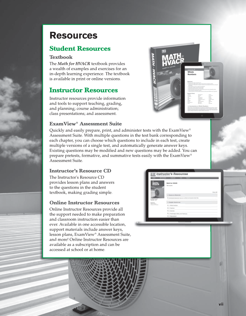Resources Student Resources Textbook The Math for HVACR textbook provides a wealth of examples and exercises for an in-depth learning experience. The textbook is available in print or online versions. Instructor Resources Instructor resources provide information and tools to support teaching, grading, and planning course administration class presentations and assessment. ExamView® Assessment Suite Quickly and easily prepare, print, and administer tests with the ExamView® Assessment Suite. With multiple questions in the test bank corresponding to each chapter, you can choose which questions to include in each test, create multiple versions of a single test, and automatically generate answer keys. Existing questions may be modifi and new questions may be added. You can fied prepare pretests, formative, and summative tests easily with the ExamView® Assessment Suite. Instructor’s Resource CD The Instructor's Resource CD provides lesson plans and answers to the questions in the student textbook, making grading simple. Online Instructor Resources Online Instructor Resources provide all the support needed to make preparation and classroom instruction easier than ever. Available in one accessible location, support materials include answer keys, lesson plans, ExamView® Assessment Suite, and more! Online Instructor Resources are available as a subscription and can be accessed at school or at home.