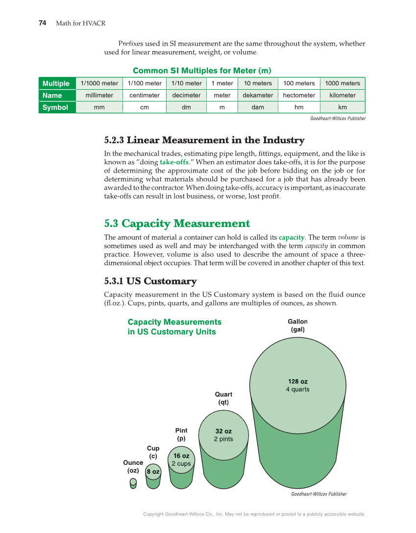 Copyright Goodheart-Willcox Co., Inc. May not be reproduced or posted to a publicly accessible website. 74 Math for HVACR Prefi used in SI measurement are the same throughout the system, whether fixes used for linear measurement, weight, or volume. Goodheart-Willcox Publisher Common SI Multiples for Meter (m) Multiple 1/100 meter 1/10 meter 1 meter 10 meters 100 meters 1/1000 meter 1000 meters Name centimeter decimeter meter dekameter hectometer millimeter kilometer Symbol km cm dm m dam hm mm 5.2.3 Linear Measurement in the Industry In the mechanical trades, estimating pipe length, fi ttings, equipment, and the like is known as ”doing take-offs.” When an estimator does take-offs, it is for the purpose of determining the approximate cost of the job before bidding on the job or for determining what materials should be purchased for a job that has already been awarded to the contractor. When doing take-offs, accuracy is important, as inaccurate take-offs can result in lost business, or worse, lost profit.fi 5.3 Capacity Measurement The amount of material a container can hold is called its capacity. The term volume is sometimes used as well and may be interchanged with the term capacity in common y practice. However, volume is also used to describe the amount of space a three- dimensional object occupies. That term will be covered in another chapter of this text. 5.3.1 US Customary Capacity measurement in the US Customary system is based on the fluid ounce (fl .oz.). Cups, pints, quarts, and gallons are multiples of ounces, as shown. 8 oz 16 oz 2 cups 32 oz 2 pints 128 oz 4 quarts Capacity Measurements in US Customary Units Ounce (oz) Cup (c) Pint (p) Quart (qt) Gallon (gal) Goodheart-Willcox Publisher