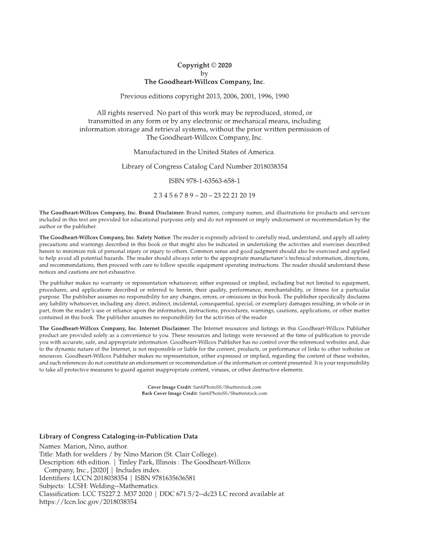 Copyright © 2020 by The Goodheart-Willcox Company, Inc. Previous editions copyright 2013, 2006, 2001, 1996, 1990 All rights reserved. No part of this work may be reproduced, stored, or transmitted in any form or by any electronic or mechanical means, including information storage and retrieval systems, without the prior written permission of The Goodheart-Willcox Company, Inc. Manufactured in the United States of America. Library of Congress Catalog Card Number 2018038354 ISBN 978-1-63563-658-1 2 3 4 5 6 7 8 9 – 20 – 23 22 21 20 19 The Goodheart-Willcox Company, Inc. Brand Disclaimer: Brand names, company names, and illustrations for products and services included in this text are provided for educational purposes only and do not represent or imply endorsement or recommendation by the author or the publisher. The Goodheart-Willcox Company, Inc. Safety Notice: The reader is expressly advised to carefully read, understand, and apply all safety precautions and warnings described in this book or that might also be indicated in undertaking the activities and exercises described herein to minimize risk of personal injury or injury to others. Common sense and good judgment should also be exercised and applied to help avoid all potential hazards. The reader should always refer to the appropriate manufacturer’s technical information, directions, and recommendations then proceed with care to follow specifi c equipment operating instructions. The reader should understand these notices and cautions are not exhaustive. The publisher makes no warranty or representation whatsoever, either expressed or implied, including but not limited to equipment, procedures, and applications described or referred to herein, their quality, performance, merchantability, or fi tness for a particular purpose. The publisher assumes no responsibility for any changes, errors, or omissions in this book. The publisher specifi cally disclaims any liability whatsoever, including any direct, indirect, incidental, consequential, special, or exemplary damages resulting, in whole or in part, from the reader’s use or reliance upon the information, instructions, procedures, warnings, cautions, applications, or other matter contained in this book. The publisher assumes no responsibility for the activities of the reader. The Goodheart-Willcox Company, Inc. Internet Disclaimer: The Internet resources and listings in this Goodheart-Willcox Publisher product are provided solely as a convenience to you. These resources and listings were reviewed at the time of publication to provide you with accurate, safe, and appropriate information. Goodheart-Willcox Publisher has no control over the referenced websites and, due to the dynamic nature of the Internet, is not responsible or liable for the content, products, or performance of links to other websites or resources. Goodheart-Willcox Publisher makes no representation, either expressed or implied, regarding the content of these websites, and such references do not constitute an endorsement or recommendation of the information or content presented. It is your responsibility to take all protective measures to guard against inappropriate content, viruses, or other destructive elements. Cover Image Credit: SantiPhotoSS/Shutterstock.com Back Cover Image Credit: SantiPhotoSS/Shutterstock.com Library of Congress Cataloging-in-Publication Data Names: Marion, Nino, author. Title: Math for welders / by Nino Marion (St. Clair College). Description: 6th edition. | Tinley Park, Illinois : The Goodheart-Willcox Company, Inc., [2020] | Includes index. Identifi ers: LCCN 2018038354 | ISBN 9781635636581 Subjects: LCSH: Welding--Mathematics. Classifi cation: LCC TS227.2 .M37 2020 | DDC 671.5/2--dc23 LC record available at https://lccn.loc.gov/2018038354 FM.indd ii FM.indd ii 8/8/2019 8:26:09 AM 8/8/2019 8:26:09 AM