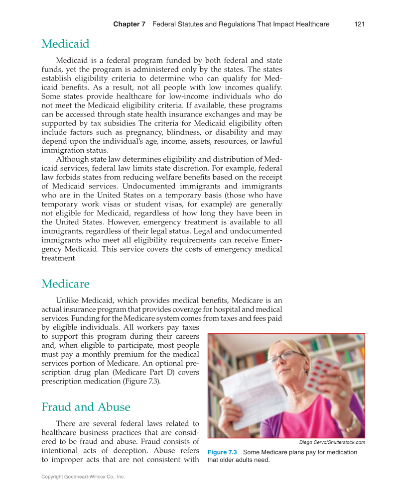 Chapter 7 Federal Statutes and Regulations That Impact Healthcare 121 Copyright Goodheart-Willcox Co., Inc. Medicaid Medicaid is a federal program funded by both federal and state funds, yet the program is administered only by the states. The states establish eligibility criteria to determine who can qualify for Med- icaid benefits. As a result, not all people with low incomes qualify. Some states provide healthcare for low-income individuals who do not meet the Medicaid eligibility criteria. If available, these programs can be accessed through state health insurance exchanges and may be supported by tax subsidies The criteria for Medicaid eligibility often include factors such as pregnancy, blindness, or disability and may depend upon the individual’s age, income, assets, resources, or lawful immigration status. Although state law determines eligibility and distribution of Med- icaid services, federal law limits state discretion. For example, federal law forbids states from reducing welfare benefits based on the receipt of Medicaid services. Undocumented immigrants and immigrants who are in the United States on a temporary basis (those who have temporary work visas or student visas, for example) are generally not eligible for Medicaid, regardless of how long they have been in the United States. However, emergency treatment is available to all immigrants, regardless of their legal status. Legal and undocumented immigrants who meet all eligibility requirements can receive Emer- gency Medicaid. This service covers the costs of emergency medical treatment. Medicare Unlike Medicaid, which provides medical benefits, Medicare is an actual insurance program that provides coverage for hospital and medical services. Funding for the Medicare system comes from taxes and fees paid by eligible individuals. All workers pay taxes to support this program during their careers and, when eligible to participate, most people must pay a monthly premium for the medical services portion of Medicare. An optional pre- scription drug plan (Medicare Part D) covers prescription medication (Figure 7.3). Fraud and Abuse There are several federal laws related to healthcare business practices that are consid- ered to be fraud and abuse. Fraud consists of intentional acts of deception. Abuse refers to improper acts that are not consistent with Diego Cervo/Shutterstock.com Figure 7.3 Some Medicare plans pay for medication that older adults need.