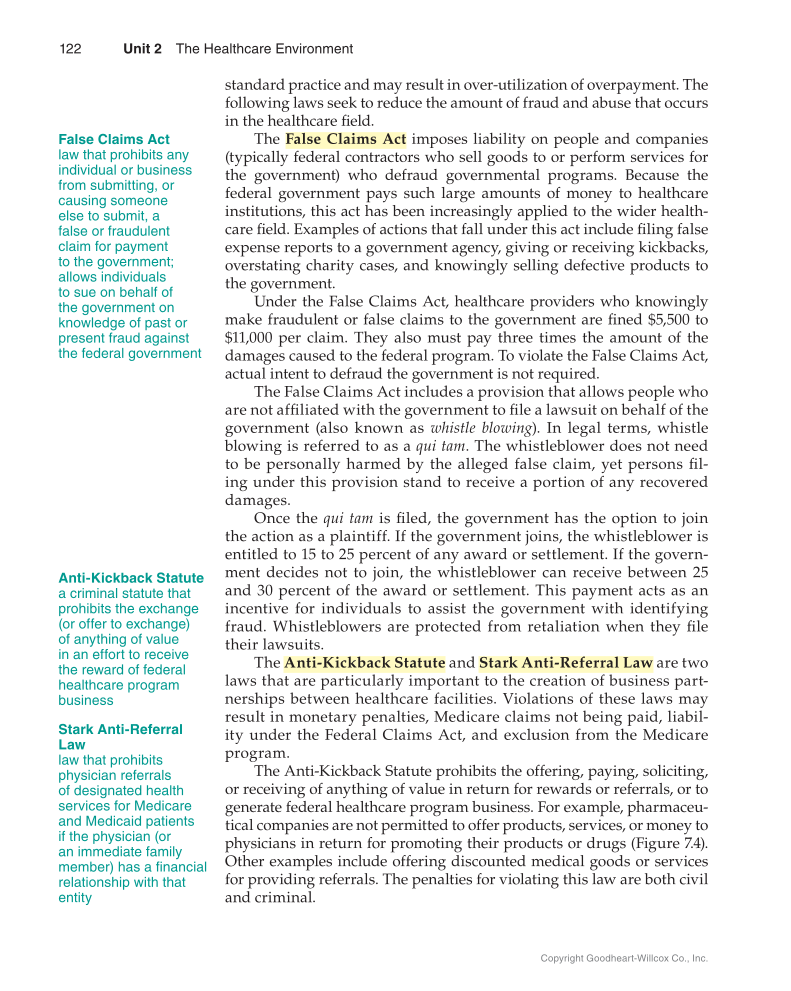 122 Unit 2 The Healthcare Environment Copyright Goodheart-Willcox Co., Inc. standard practice and may result in over- utilization of overpayment. The following laws seek to reduce the amount of fraud and abuse that occurs in the healthcare field. The False Claims Act imposes liability on people and companies (typically federal contractors who sell goods to or perform services for the government) who defraud governmental programs. Because the federal government pays such large amounts of money to healthcare institutions, this act has been increasingly applied to the wider health- care field. Examples of actions that fall under this act include filing false expense reports to a government agency, giving or receiving kickbacks, overstating charity cases, and knowingly selling defective products to the government. Under the False Claims Act, healthcare providers who knowingly make fraudulent or false claims to the government are fined $5,500 to $11,000 per claim. They also must pay three times the amount of the damages caused to the federal program. To violate the False Claims Act, actual intent to defraud the government is not required. The False Claims Act includes a provision that allows people who are not affiliated with the government to file a lawsuit on behalf of the government (also known as whistle blowing). In legal terms, whistle blowing is referred to as a qui tam. The whistleblower does not need to be personally harmed by the alleged false claim, yet persons fil- ing under this provision stand to receive a portion of any recovered damages. Once the qui tam is filed, the government has the option to join the action as a plaintiff. If the government joins, the whistleblower is entitled to 15 to 25 percent of any award or settlement. If the govern- ment decides not to join, the whistleblower can receive between 25 and 30 percent of the award or settlement. This payment acts as an incentive for individuals to assist the government with identifying fraud. Whistleblowers are protected from retaliation when they file their lawsuits. The Anti-Kickback Statute and Stark Anti-Referral Law are two laws that are particularly important to the creation of business part- nerships between healthcare facilities. Violations of these laws may result in monetary penalties, Medicare claims not being paid, liabil- ity under the Federal Claims Act, and exclusion from the Medicare program. The Anti-Kickback Statute prohibits the offering, paying, soliciting, or receiving of anything of value in return for rewards or referrals, or to generate federal healthcare program business. For example, pharmaceu- tical companies are not permitted to offer products, services, or money to physicians in return for promoting their products or drugs (Figure 7.4). Other examples include offering discounted medical goods or services for providing referrals. The penalties for violating this law are both civil and criminal. False Claims Act law that prohibits any individual or business from submitting, or causing someone else to submit, a false or fraudulent claim for payment to the government allows individuals to sue on behalf of the government on knowledge of past or present fraud against the federal government Anti-Kickback Statute a criminal statute that prohibits the exchange (or offer to exchange) of anything of value in an effort to receive the reward of federal healthcare program business Stark Anti-Referral Law law that prohibits physician referrals of designated health services for Medicare and Medicaid patients if the physician (or an immediate family member) has a financial relationship with that entity