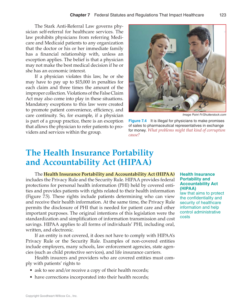 Chapter 7 Federal Statutes and Regulations That Impact Healthcare 123 Copyright Goodheart-Willcox Co., Inc. The Stark Anti-Referral Law governs phy- sician self-referral for healthcare services. The law prohibits physicians from referring Medi- care and Medicaid patients to any organization that the doctor or his or her immediate family has a financial relationship with, unless an exception applies. The belief is that a physician may not make the best medical decision if he or she has an economic interest. If a physician violates this law, he or she may have to pay up to $15,000 in penalties for each claim and three times the amount of the improper collection. Violations of the False Claim Act may also come into play in these situations. Mandatory exceptions to this law were created to promote patient convenience, efficiency, and care continuity. So, for example, if a physician is part of a group practice, there is an exception that allows the physician to refer patients to pro- viders and services within the group. The Health Insurance Portability and Accountability Act (HIPAA) The Health Insurance Portability and Accountability Act (HIPAA) includes the Privacy Rule and the Security Rule. HIPAA provides federal protections for personal health information (PHI) held by covered enti- ties and provides patients with rights related to their health information (Figure 7.5). These rights include patients determining who can view and receive their health information. At the same time, the Privacy Rule permits the disclosure of PHI that is needed for patient care and other important purposes. The original intentions of this legislation were the standardization and simplification of information transmission and cost savings. HIPAA applies to all forms of individuals’ PHI, including oral, written, and electronic. If an entity is not covered, it does not have to comply with HIPAA’s Privacy Rule or the Security Rule. Examples of non-covered entities include employers, many schools, law enforcement agencies, state agen- cies (such as child protective services), and life insurance carriers. Health insurers and providers who are covered entities must com- ply with patients’ rights to · ask to see and/or receive a copy of their health records · have corrections incorporated into their health records Health Insurance Portability and Accountability Act (HIPAA) law that aims to protect the confidentiality and security of healthcare information and help control administrative costs Image Point Fr/Shutterstock.com Figure 7.4 It is illegal for physicians to make promises of sales to pharmaceutical representatives in exchange for money. What problems might that kind of corruption cause?