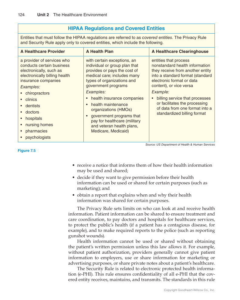 124 Unit 2 The Healthcare Environment Copyright Goodheart-Willcox Co., Inc. · receive a notice that informs them of how their health information may be used and shared · decide if they want to give permission before their health information can be used or shared for certain purposes (such as marketing) and · obtain a report that explains when and why their health information was shared for certain purposes. The Privacy Rule sets limits on who can look at and receive health information. Patient information can be shared to ensure treatment and care coordination, to pay doctors and hospitals for healthcare services, to protect the public’s health (if a patient has a contagious disease, for example), and to make required reports to the police (such as reporting gunshot wounds). Health information cannot be used or shared without obtaining the patient’s written permission unless this law allows it. For example, without patient authorization, providers generally cannot give patient information to employers, use or share information for marketing or advertising purposes, or share private notes about a patient’s healthcare. The Security Rule is related to electronic protected health informa- tion (e-PHI). This rule ensures confidentiality of all e-PHI that the cov- ered entity receives, maintains, and transmits. The standards in this rule HIPAA Regulations and Covered Entities Entities that must follow the HIPAA regulations are referred to as covered entities. The Privacy Rule and Security Rule apply only to covered entities, which include the following. A Healthcare Provider A Health Plan A Healthcare Clearinghouse a provider of services who conducts certain business electronically, such as electronically billing health insurance companies Examples: · chiropractors · clinics · dentists · doctors · hospitals · nursing homes · pharmacies · psychologists with certain exceptions, an individual or group plan that provides or pays the cost of medical care includes many types of organizations and government programs Examples: · health insurance companies · health maintenance organizations (HMOs) · government programs that pay for healthcare (military and veteran health plans, Medicare, Medicaid) entities that process nonstandard health information they receive from another entity into a standard format (standard electronic format or data content), or vice versa Example: · billing service that processes or facilitates the processing of data from one format into a standardized billing format Source: US Department of Health & Human Services Figure 7.5