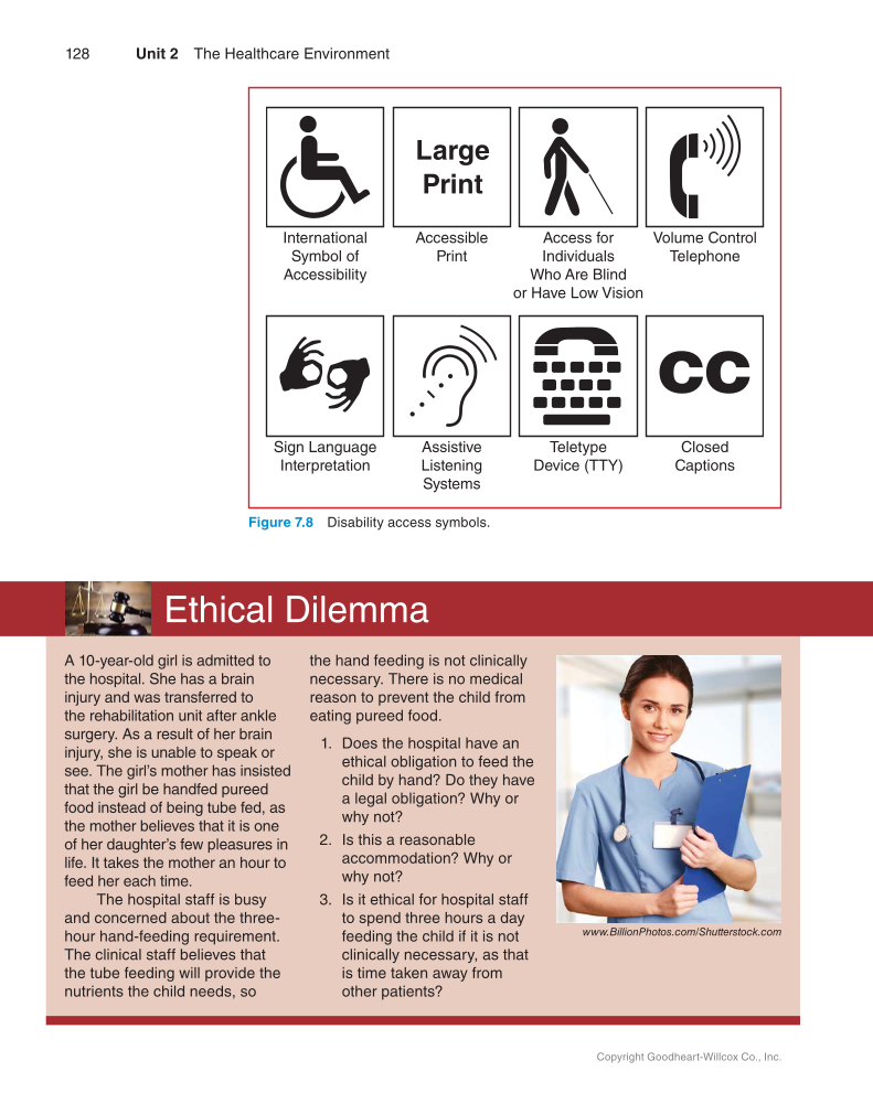 128 Unit 2 The Healthcare Environment Copyright Goodheart-Willcox Co., Inc. CC Large Print International Symbol of Accessibility Accessible Print Access for Individuals Who Are Blind or Have Low Vision Volume Control Telephone Sign Language Interpretation Assistive Listening Systems Teletype Device (TTY) Closed Captions Figure 7.8 Disability access symbols. A 10-year-old girl is admitted to the hospital. She has a brain injury and was transferred to the rehabilitation unit after ankle surgery. As a result of her brain injury, she is unable to speak or see. The girl’s mother has insisted that the girl be handfed pureed food instead of being tube fed, as the mother believes that it is one of her daughter’s few pleasures in life. It takes the mother an hour to feed her each time. The hospital staff is busy and concerned about the three- hour hand-feeding requirement. The clinical staff believes that the tube feeding will provide the nutrients the child needs, so the hand feeding is not clinically necessary. There is no medical reason to prevent the child from eating pureed food. 1. Does the hospital have an ethical obligation to feed the child by hand? Do they have a legal obligation? Why or why not? 2. Is this a reasonable accommodation? Why or why not? 3. Is it ethical for hospital staff to spend three hours a day feeding the child if it is not clinically necessary, as that is time taken away from other patients? Ethical Dilemma www.BillionPhotos.com/Shutterstock.com