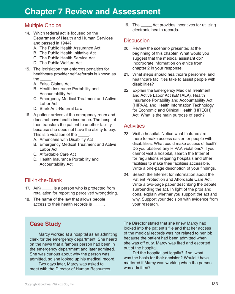 Copyright Goodheart-Willcox Co., Inc. 133 Chapter 7 Review and Assessment Multiple Choice 14. Which federal act is focused on the Department of Health and Human Services and passed in 1944? A. The Public Health Assurance Act B. The Public Health Initiative Act C. The Public Health Service Act D. The Public Welfare Act 15. The legislation that enforces penalties for healthcare provider self-referrals is known as the _____. A. False Claims Act B. Health Insurance Portability and Accountability Act C. Emergency Medical Treatment and Active Labor Act D. Stark Anti-Referral Law 16. A patient arrives at the emergency room and does not have health insurance. The hospital then transfers the patient to another facility because she does not have the ability to pay. This is a violation of the _____. A. Americans with Disability Act B. Emergency Medical Treatment and Active Labor Act C. Affordable Care Act D. Health Insurance Portability and Accountability Act Fill-in-the-Blank 17. A(n) _____ is a person who is protected from retaliation for reporting perceived wrongdoing. 18. The name of the law that allows people access to their health records is _____. 19. The _____ Act provides incentives for utilizing electronic health records. Discussion 20. Review the scenario presented at the beginning of this chapter. What would you suggest that the medical assistant do? Incorporate information on ethics from chapter 2 in your response. 21. What steps should healthcare personnel and healthcare facilities take to assist people with disabilities? 22. Explain the Emergency Medical Treatment and Active Labor Act (EMTALA), Health Insurance Portability and Accountability Act (HIPAA), and Health Information Technology for Economic and Clinical Health (HITECH) Act. What is the main purpose of each? Activities 23. Visit a hospital. Notice what features are there to make access easier for people with disabilities. What could make access difficult? Do you observe any HIPAA violations? If you cannot visit a hospital, search the Internet for regulations requiring hospitals and other facilities to make their facilities accessible. Write a one-page description of your findings. 24. Search the Internet for information about the Patient Protection and Affordable Care Act. Write a two-page paper describing the debate surrounding the act. In light of the pros and cons, explain whether you support the act and why. Support your decision with evidence from your research. Case Study Marcy worked at a hospital as an admitting clerk for the emergency department. She heard on the news that a famous person had been in the emergency department and later admitted. She was curious about why the person was admitted, so she looked up his medical record. Two days later, Marcy was asked to meet with the Director of Human Resources. The Director stated that she knew Marcy had looked into the patient’s file and that her access of the medical records was not related to her job because the patient had been admitted when she was off duty. Marcy was fired and escorted out of the hospital. Did the hospital act legally? If so, what was the basis for their decision? Would it have mattered if Marcy was working when the person was admitted?