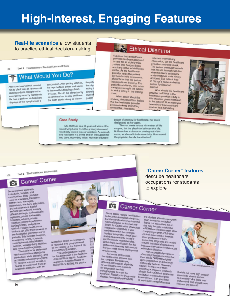 iv iv High-Interest, Engaging Features Real-life scenarios allow students to practice ethical decision-making “Career Corner” features describe healthcare occupations for students to explore