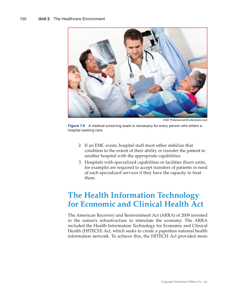 Copyright Goodheart-Willcox Co., Inc 130 Unit 2 The Healthcare Environment 2. If an EMC exists, hospital staff must either stabilize that condition to the extent of their ability or transfer the patient to another hospital with the appropriate capabilities. 3. Hospitals with specialized capabilities or facilities (burn units, for example) are required to accept transfers of patients in need of such specialized services if they have the capacity to treat them. The Health Information Technology for Economic and Clinical Health Act The American Recovery and Reinvestment Act (ARRA) of 2009 invested in the nation’s infrastructure to stimulate the economy. The ARRA included the Health Information Technology for Economic and Clinical Health (HITECH) Act, which seeks to create a paperless national health information network. To achieve this, the HITECH Act provided more ESB Professional/Shutterstock.com Figure 7.9 A medical screening exam is necessary for every person who enters a hospital seeking care.