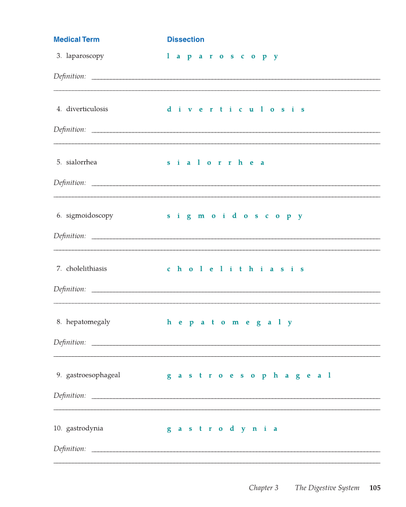 Chapter 3 The Digestive System 105 Medical Term Dissection 3. laparoscopy l a p a r o s c o p y Defi nition: ___________________________________________________________________________________________ _______________________________________________________________________________________________________ 4. diverticulosis d i v e r t i c u l o s i s Defi nition: ___________________________________________________________________________________________ _______________________________________________________________________________________________________ 5. sialorrhea s i a l o r r h e a Defi nition: ___________________________________________________________________________________________ _______________________________________________________________________________________________________ 6. sigmoidoscopy s i g m o i d o s c o p y Defi nition: ___________________________________________________________________________________________ _______________________________________________________________________________________________________ 7. cholelithiasis c h o l e l i t h i a s i s Defi nition: ___________________________________________________________________________________________ _______________________________________________________________________________________________________ 8. hepatomegaly h e p a t o m e g a l y Defi nition: ___________________________________________________________________________________________ _______________________________________________________________________________________________________ 9. gastroesophageal g a s t r o e s o p h a g e a l Defi nition: ___________________________________________________________________________________________ _______________________________________________________________________________________________________ 10. gastrodynia g a s t r o d y n i a Defi nition: ___________________________________________________________________________________________ _______________________________________________________________________________________________________