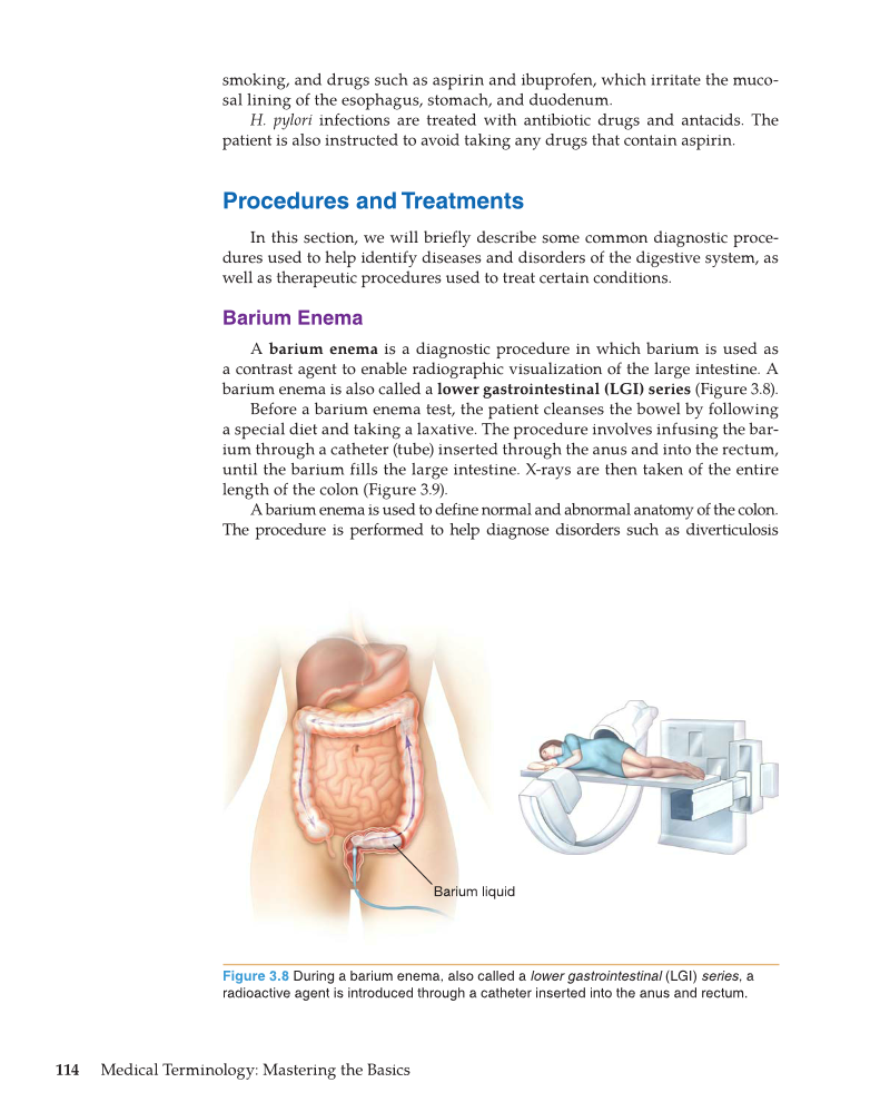 114 Medical Terminology: Mastering the Basics smoking, and drugs such as aspirin and ibuprofen, which irritate the muco- sal lining of the esophagus, stomach, and duodenum. H. pylori infections are treated with antibiotic drugs and antacids. The patient is also instructed to avoid taking any drugs that contain aspirin. Procedures and Treatments In this section, we will briefly describe some common diagnostic proce- dures used to help identify diseases and disorders of the digestive system, as well as therapeutic procedures used to treat certain conditions. Barium Enema A barium enema is a diagnostic procedure in which barium is used as a contrast agent to enable radiographic visualization of the large intestine. A barium enema is also called a lower gastrointestinal (LGI) series (Figure 3.8). Before a barium enema test, the patient cleanses the bowel by following a special diet and taking a laxative. The procedure involves infusing the bar- ium through a catheter (tube) inserted through the anus and into the rectum, until the barium fills the large intestine. X-rays are then taken of the entire length of the colon (Figure 3.9). A barium enema is used to define normal and abnormal anatomy of the colon. The procedure is performed to help diagnose disorders such as diverticulosis Figure 3.8 During a barium enema, also called a lower gastrointestinal (LGI) series, a radioactive agent is introduced through a catheter inserted into the anus and rectum. Barium liquid