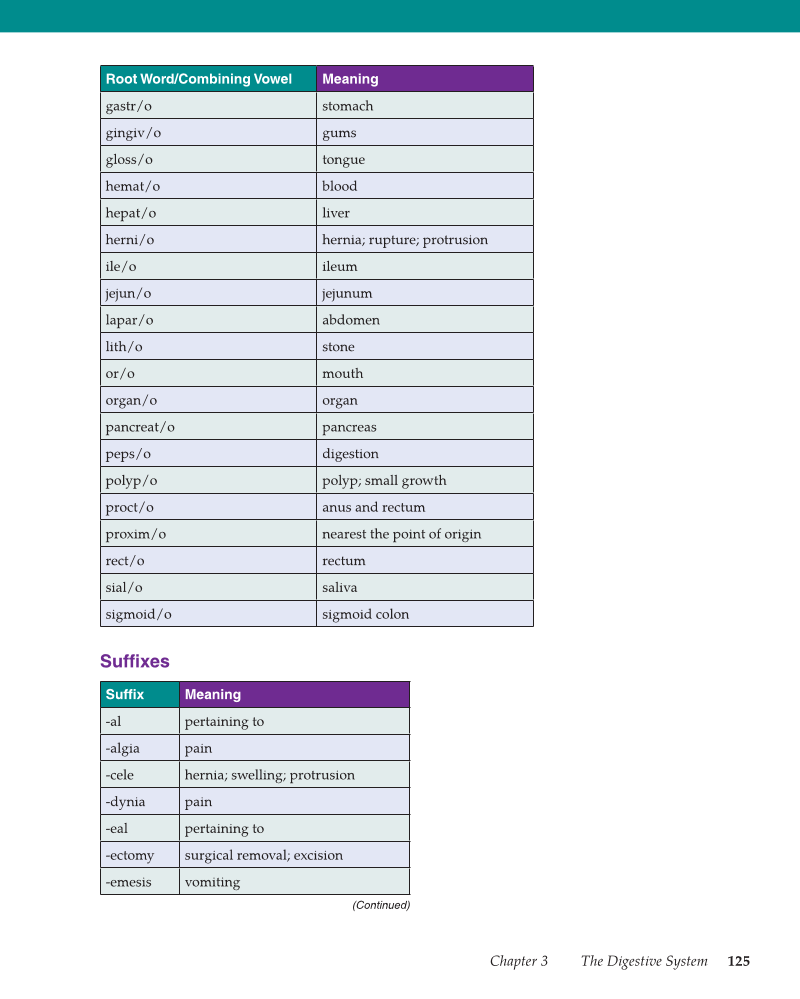 Chapter 3 The Digestive System 125 Root Word/Combining Vowel Meaning gastr/o stomach gingiv/o gums gloss/o tongue hemat/o blood hepat/o liver herni/o hernia rupture protrusion ile/o ileum jejun/o jejunum lapar/o abdomen lith/o stone or/o mouth organ/o organ pancreat/o pancreas peps/o digestion polyp/o polyp small growth proct/o anus and rectum proxim/o nearest the point of origin rect/o rectum sial/o saliva sigmoid/o sigmoid colon Suffi xes Suffi x Meaning -al pertaining to -algia pain -cele hernia swelling protrusion -dynia pain -eal pertaining to -ectomy surgical removal excision -emesis vomiting (Continued)