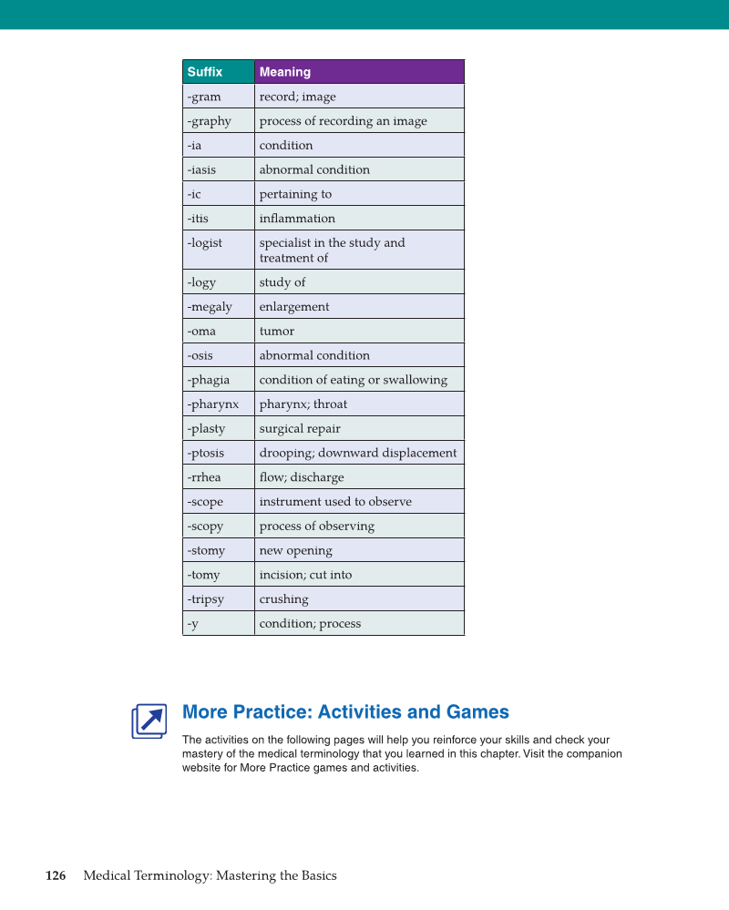 126 Medical Terminology: Mastering the Basics Suffi x Meaning -gram record image -graphy process of recording an image -ia condition -iasis abnormal condition -ic pertaining to -itis infl ammation -logist specialist in the study and treatment of -logy study of -megaly enlargement -oma tumor -osis abnormal condition -phagia condition of eating or swallowing -pharynx pharynx throat -plasty surgical repair -ptosis drooping downward displacement -rrhea fl ow discharge -scope instrument used to observe -scopy process of observing -stomy new opening -tomy incision cut into -tripsy crushing -y condition process More Practice: Activities and Games The activities on the following pages will help you reinforce your skills and check your mastery of the medical terminology that you learned in this chapter. Visit the companion website for More Practice games and activities.