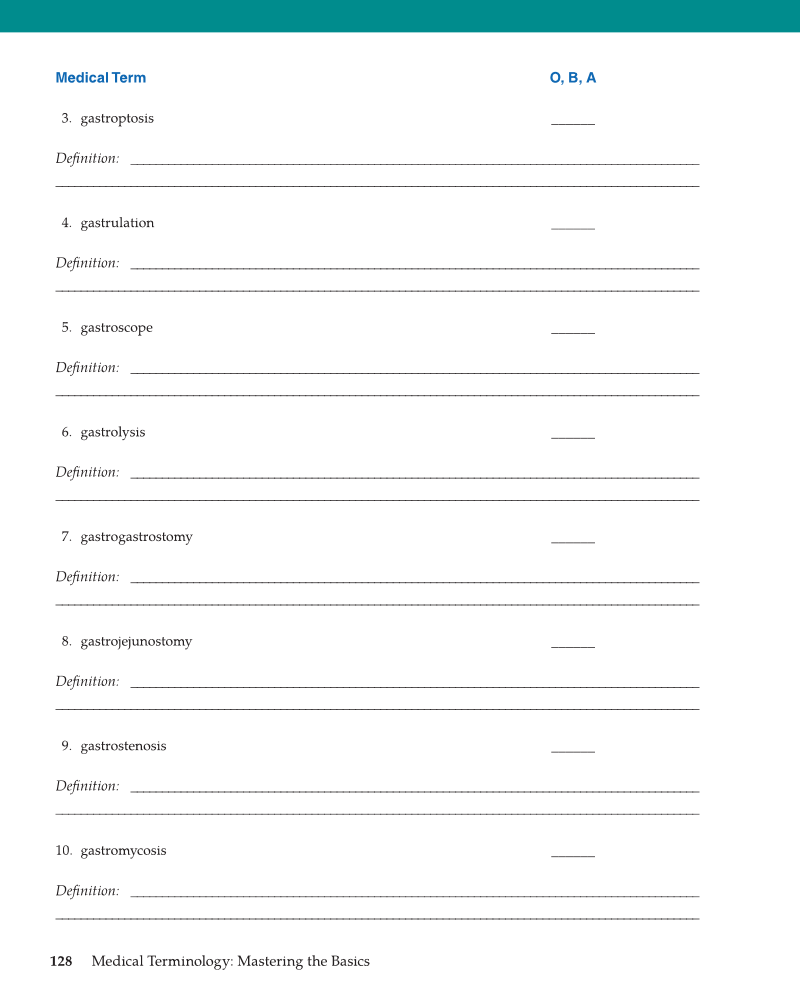 128 Medical Terminology: Mastering the Basics Medical Term O, B, A 3. gastroptosis ______ Defi nition: ___________________________________________________________________________________________ _______________________________________________________________________________________________________ 4. gastrulation ______ Defi nition: ___________________________________________________________________________________________ _______________________________________________________________________________________________________ 5. gastroscope ______ Defi nition: ___________________________________________________________________________________________ _______________________________________________________________________________________________________ 6. gastrolysis ______ Defi nition: ___________________________________________________________________________________________ _______________________________________________________________________________________________________ 7. gastrogastrostomy ______ Defi nition: ___________________________________________________________________________________________ _______________________________________________________________________________________________________ 8. gastrojejunostomy ______ Defi nition: ___________________________________________________________________________________________ _______________________________________________________________________________________________________ 9. gastrostenosis ______ Defi nition: ___________________________________________________________________________________________ _______________________________________________________________________________________________________ 10. gastromycosis ______ Defi nition: ___________________________________________________________________________________________ _______________________________________________________________________________________________________