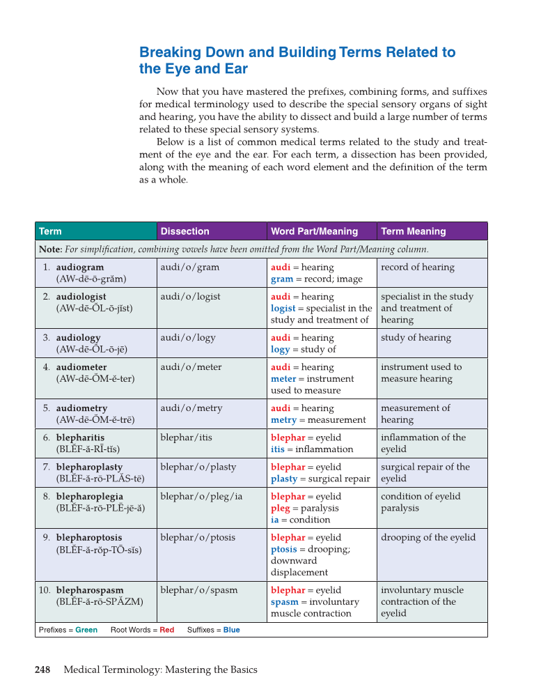 248 Medical Terminology: Mastering the Basics Breaking Down and Building Terms Related to the Eye and Ear Now that you have mastered the prefixes, combining forms, and suffixes for medical terminology used to describe the special sensory organs of sight and hearing, you have the ability to dissect and build a large number of terms related to these special sensory systems. Below is a list of common medical terms related to the study and treat- ment of the eye and the ear. For each term, a dissection has been provided, along with the meaning of each word element and the definition of the term as a whole. Term Dissection Word Part/Meaning Term Meaning Note: For simplifi cation, combining vowels have been omitted from the Word Part/Meaning column. 1. audiogram (AW-dē-ō-grăm) audi/o/gram audi = hearing gram = record image record of hearing 2. audiologist (AW-dē-ŎL-ō-jĭst) audi/o/logist audi = hearing logist = specialist in the study and treatment of specialist in the study and treatment of hearing 3. audiology (AW-dē-ŎL-ō-jē) audi/o/logy audi = hearing logy = study of study of hearing 4. audiometer (AW-dē-ŎM-ĕ-ter) audi/o/meter audi = hearing meter = instrument used to measure instrument used to measure hearing 5. audiometry (AW-dē-ŎM-ĕ-trē) audi/o/metry audi = hearing metry = measurement measurement of hearing 6. blepharitis (BLĔF-ă-RĪ-tĭs) blephar/itis blephar = eyelid itis = infl ammation infl ammation of the eyelid 7. blepharoplasty (BLĔF-ă-rō-PLĂS-tē) blephar/o/plasty blephar = eyelid plasty = surgical repair surgical repair of the eyelid 8. blepharoplegia (BLĔF-ă-rō-PLĒ-jē-ă) blephar/o/pleg/ia blephar = eyelid pleg = paralysis ia = condition condition of eyelid paralysis 9. blepharoptosis (BLĔF-ă-rŏp-TŌ-sĭs) blephar/o/ptosis blephar = eyelid ptosis = drooping downward displacement drooping of the eyelid 10. blepharospasm (BLĔF-ă-rō-SPĂZM) blephar/o/spasm blephar = eyelid spasm = involuntary muscle contraction involuntary muscle contraction of the eyelid Prefi xes = Green Root Words = Red Suffi xes = Blue