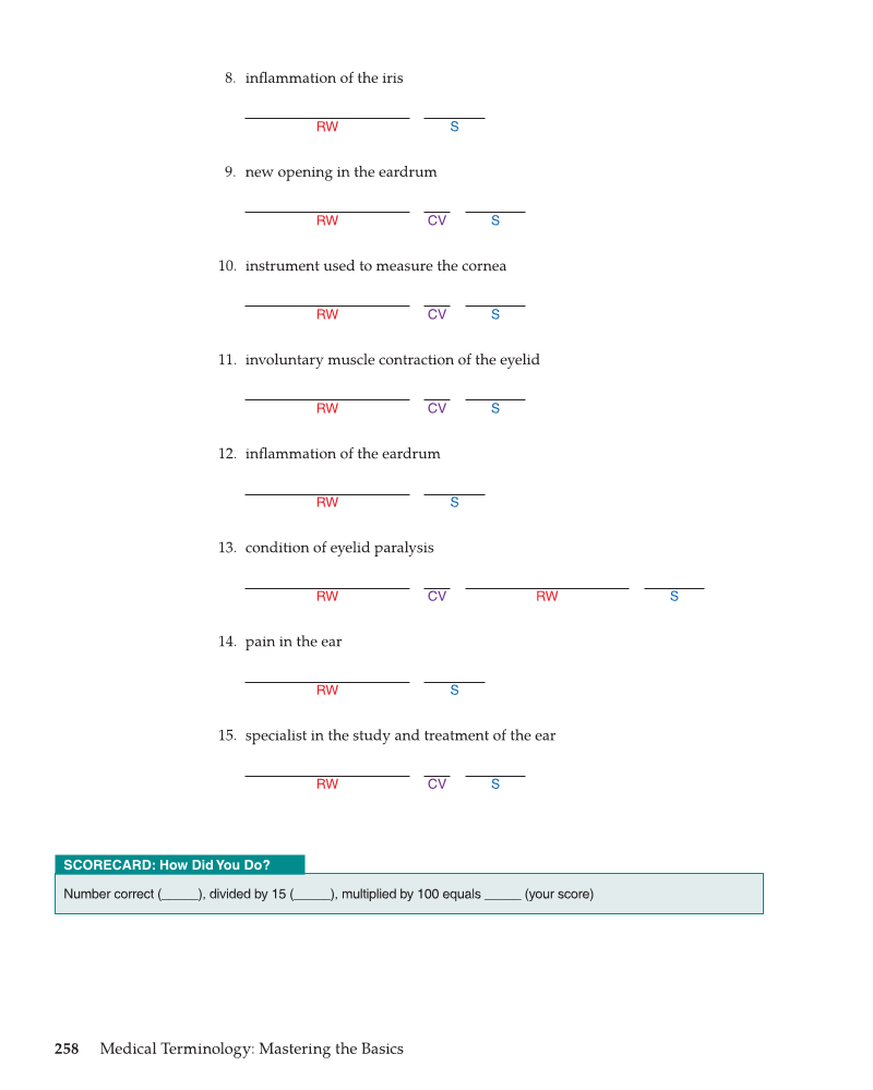 258 Medical Terminology: Mastering the Basics 8. infl ammation of the iris RW S 9. new opening in the eardrum RW CV S 10. instrument used to measure the cornea RW CV S 11. involuntary muscle contraction of the eyelid RW CV S 12. infl ammation of the eardrum RW S 13. condition of eyelid paralysis RW CV RW S 14. pain in the ear RW S 15. specialist in the study and treatment of the ear RW CV S SCORECARD: How Did You Do? Number correct (_____), divided by 15 (_____), multiplied by 100 equals _____ (your score)