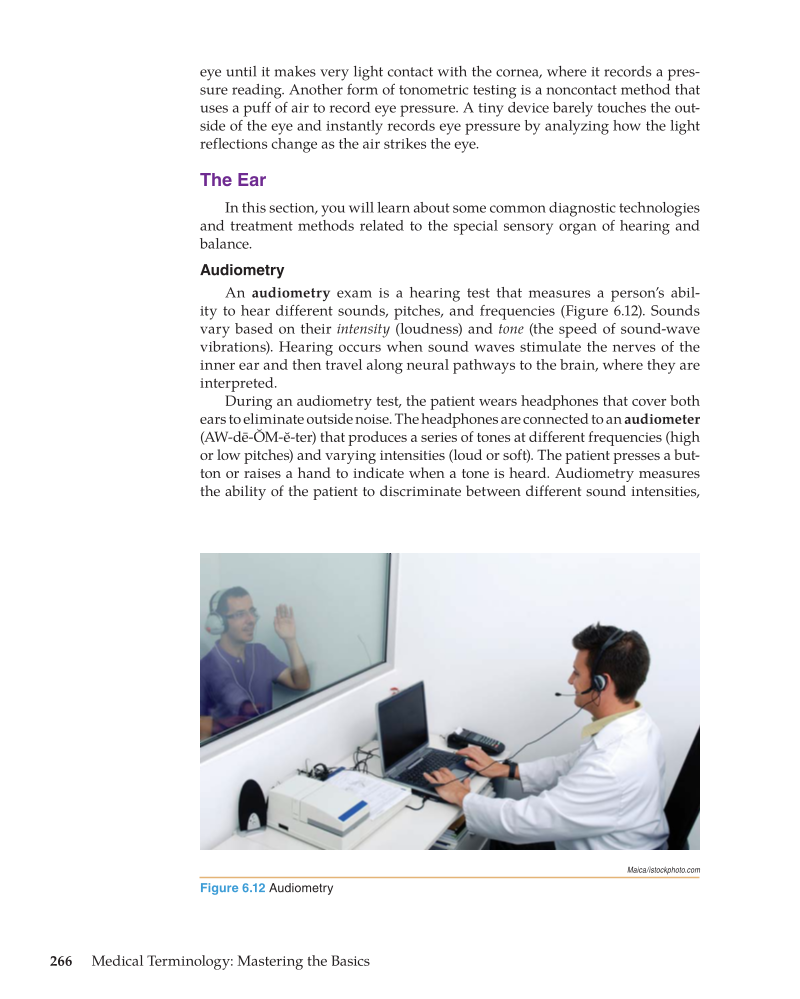 266 Medical Terminology: Mastering the Basics eye until it makes very light contact with the cornea, where it records a pres- sure reading. Another form of tonometric testing is a noncontact method that uses a puff of air to record eye pressure. A tiny device barely touches the out- side of the eye and instantly records eye pressure by analyzing how the light reflections change as the air strikes the eye. The Ear In this section, you will learn about some common diagnostic technologies and treatment methods related to the special sensory organ of hearing and balance. Audiometry An audiometry exam is a hearing test that measures a person’s abil- ity to hear different sounds, pitches, and frequencies (Figure 6.12). Sounds vary based on their intensity (loudness) and tone (the speed of sound-wave vibrations). Hearing occurs when sound waves stimulate the nerves of the inner ear and then travel along neural pathways to the brain, where they are interpreted. During an audiometry test, the patient wears headphones that cover both ears to eliminate outside noise. The headphones are connected to an audiometer (AW-dē-ŎM-ĕ-ter) that produces a series of tones at different frequencies (high or low pitches) and varying intensities (loud or soft). The patient presses a but- ton or raises a hand to indicate when a tone is heard. Audiometry measures the ability of the patient to discriminate between different sound intensities, Maica/istockphoto.com Figure 6.12 Audiometry
