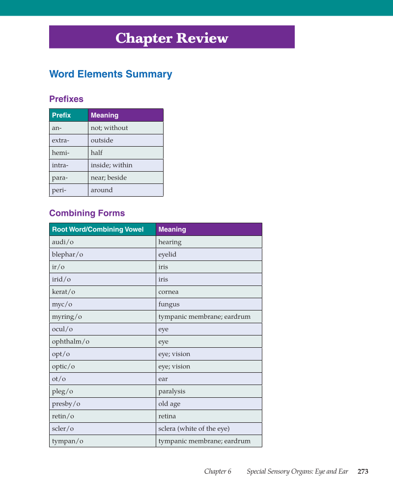 Chapter 6 Special Sensory Organs: Eye and Ear 273 Chapter Review Word Elements Summary Prefi xes Prefi x Meaning an- not without extra- outside hemi- half intra- inside within para- near beside peri- around Combining Forms Root Word/Combining Vowel Meaning audi/o hearing blephar/o eyelid ir/o iris irid/o iris kerat/o cornea myc/o fungus myring/o tympanic membrane eardrum ocul/o eye ophthalm/o eye opt/o eye vision optic/o eye vision ot/o ear pleg/o paralysis presby/o old age retin/o retina scler/o sclera (white of the eye) tympan/o tympanic membrane eardrum