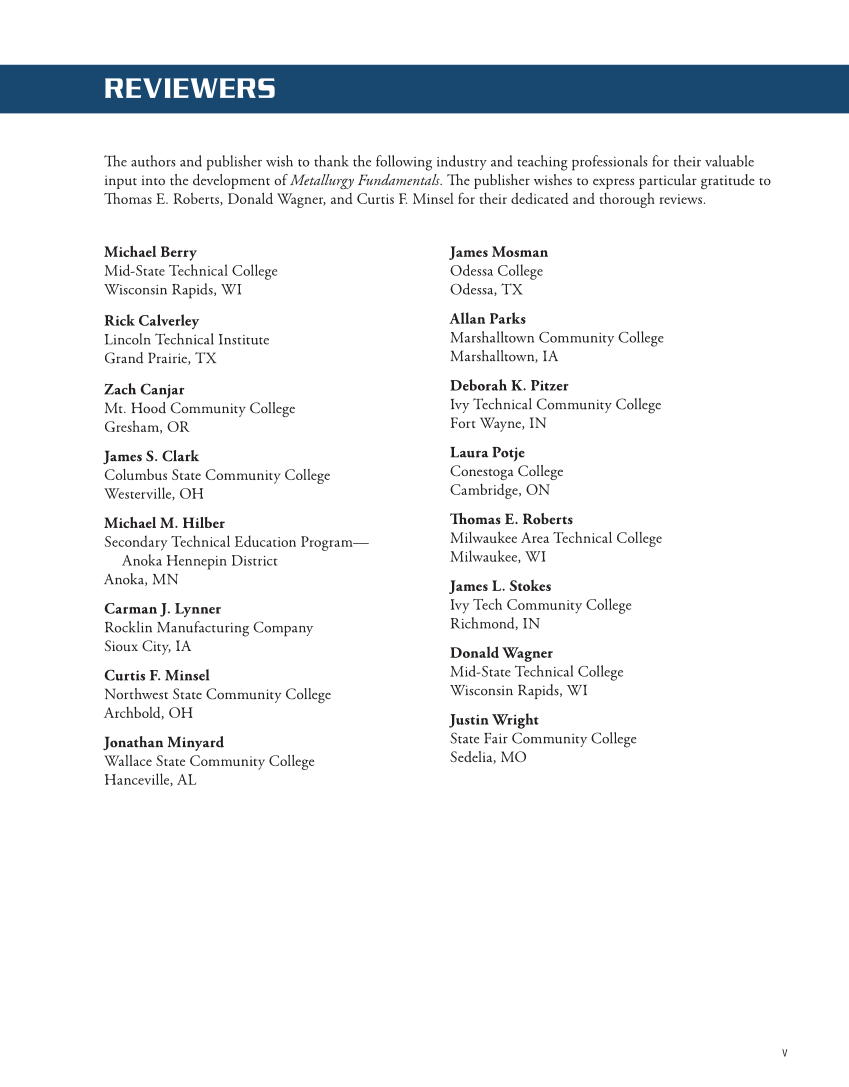REVIEWERS The authors and publisher wish to thank the following industry and teaching professionals for their valuable input into the development of Metallurgy Fundamentals. The publisher wishes to express particular gratitude to Thomas E. Roberts, Donald Wagner, and Curtis F. Minsel for their dedicated and thorough reviews. Michael Berry Mid-State Technical College Wisconsin Rapids, WI Rick Calverley Lincoln Technical Institute Grand Prairie, TX Zach Canjar Mt. Hood Community College Gresham, OR James S. Clark Columbus State Community College Westerville, OH Michael M. Hilber Secondary Technical Education Program— Anoka Hennepin District Anoka, MN Carman J. Lynner Rocklin Manufacturing Company Sioux City, IA Curtis F. Minsel Northwest State Community College Archbold, OH Jonathan Minyard Wallace State Community College Hanceville, AL James Mosman Odessa College Odessa, TX Allan Parks Marshalltown Community College Marshalltown, IA Deborah K. Pitzer Ivy Technical Community College Fort Wayne, IN Laura Potje Conestoga College Cambridge, ON Thomas E. Roberts Milwaukee Area Technical College Milwaukee, WI James L. Stokes Ivy Tech Community College Richmond, IN Donald Wagner Mid-State Technical College Wisconsin Rapids, WI Justin Wright State Fair Community College Sedelia, MO v