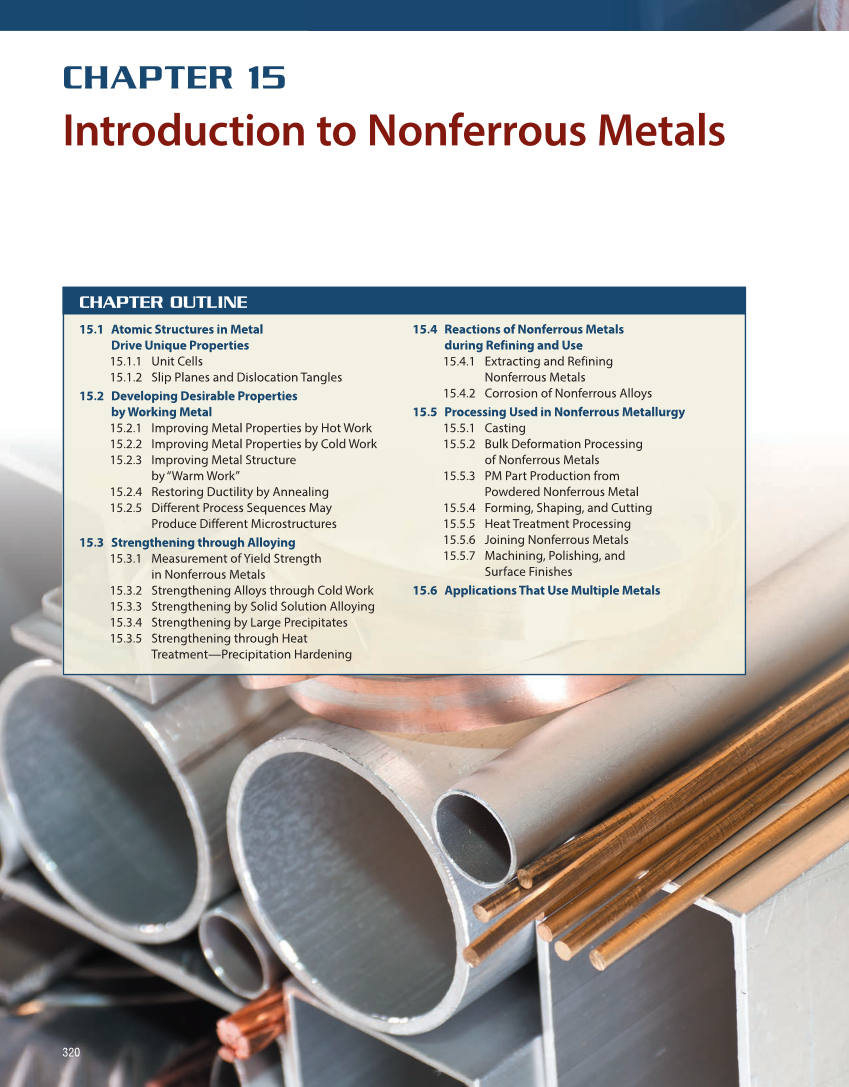 320 CHAPTER 15 Introduction to Nonferrous Metals C HAPTER OUTLINE 15.1 Atomic Structures in Metal Drive Unique Properties 15.1.1 Unit Cells 15.1.2 Slip Planes and Dislocation Tangles 15.2 Developing Desirable Properties by Working Metal 15.2.1 Improving Metal Properties by Hot Work 15.2.2 Improving Metal Properties by Cold Work 15.2.3 Improving Metal Structure by “Warm Work” 15.2.4 Restoring Ductility by Annealing 15.2.5 Different Process Sequences May Produce Different Microstructures 15.3 Strengthening through Alloying 15.3.1 Measurement of Yield Strength in Nonferrous Metals 15.3.2 Strengthening Alloys through Cold Work 15.3.3 Strengthening by Solid Solution Alloying 15.3.4 Strengthening by Large Precipitates 15.3.5 Strengthening through Heat Treatment—Precipitation Hardening 15.4 Reactions of Nonferrous Metals during Refining and Use 15.4.1 Extracting and Refining Nonferrous Metals 15.4.2 Corrosion of Nonferrous Alloys 15.5 Processing Used in Nonferrous Metallurgy 15.5.1 Casting 15.5.2 Bulk Deformation Processing of Nonferrous Metals 15.5.3 PM Part Production from Powdered Nonferrous Metal 15.5.4 Forming, Shaping, and Cutting 15.5.5 Heat Treatment Processing 15.5.6 Joining Nonferrous Metals 15.5.7 Machining, Polishing, and Surface Finishes 15.6 Applications That Use Multiple Metals