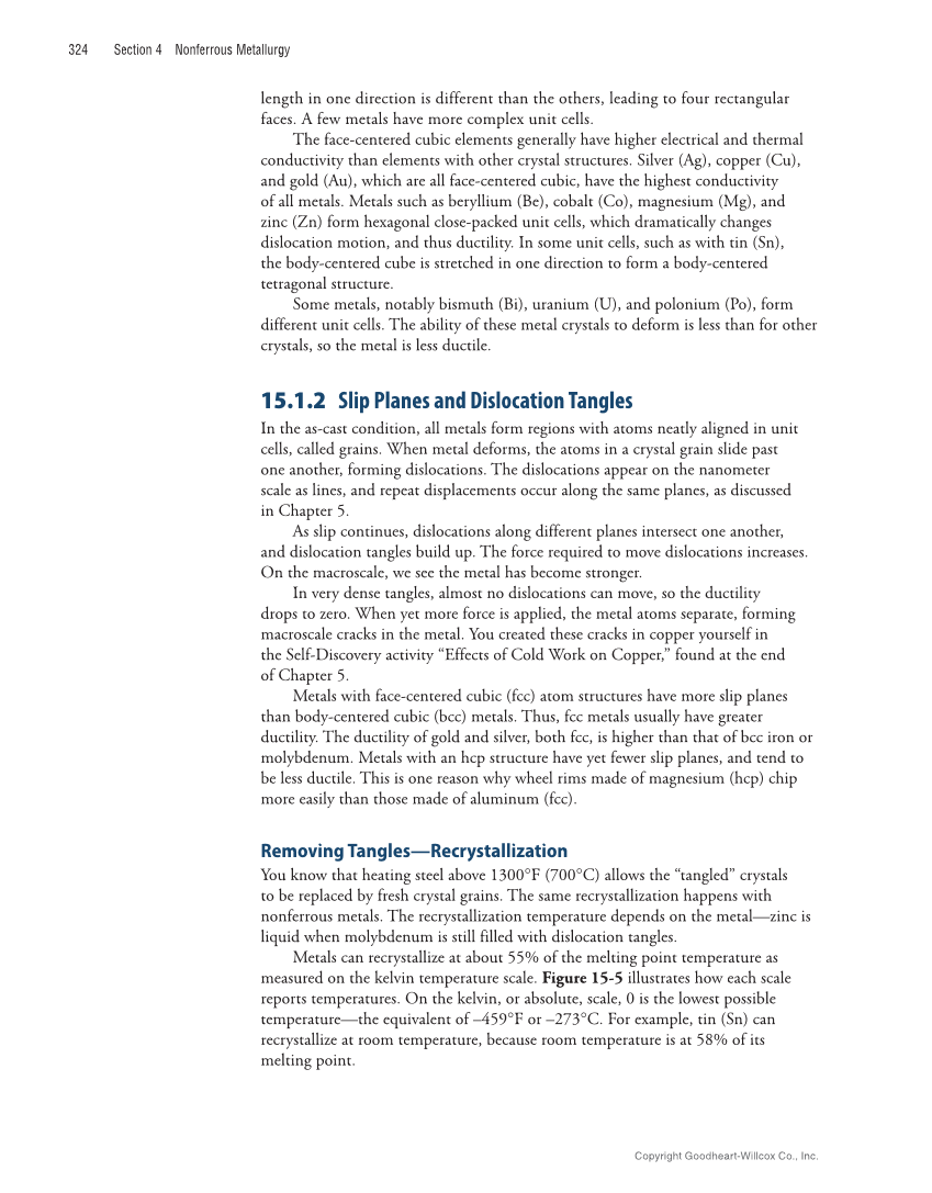 324 Section 4 Nonferrous Metallurgy length in one direction is different than the others, leading to four rectangular faces. A few metals have more complex unit cells. The face-centered cubic elements generally have higher electrical and thermal conductivity than elements with other crystal structures. Silver (Ag), copper (Cu), and gold (Au), which are all face-centered cubic, have the highest conductivity of all metals. Metals such as beryllium (Be), cobalt (Co), magnesium (Mg), and zinc (Zn) form hexagonal close-packed unit cells, which dramatically changes dislocation motion, and thus ductility. In some unit cells, such as with tin (Sn), the body-centered cube is stretched in one direction to form a body-centered tetragonal structure. Some metals, notably bismuth (Bi), uranium (U), and polonium (Po), form different unit cells. The ability of these metal crystals to deform is less than for other crystals, so the metal is less ductile. 15.1.2 Sl ip Planes and Dislocation Tangles In the as-cast condition, all metals form regions with atoms neatly aligned in unit cells, called grains. When metal deforms, the atoms in a crystal grain slide past one another, forming dislocations. The dislocations appear on the nanometer scale as lines, and repeat displacements occur along the same planes, as discussed in Chapter 5. As slip continues, dislocations along different planes intersect one another, and dislocation tangles build up. The force required to move dislocations increases. On the macroscale, we see the metal has become stronger. In very dense tangles, almost no dislocations can move, so the ductility drops to zero. When yet more force is applied, the metal atoms separate, forming macroscale cracks in the metal. You created these cracks in copper yourself in the Self-Discovery activity “Effects of Cold Work on Copper,” found at the end of Chapter 5. Metals with face-centered cubic (fcc) atom structures have more slip planes than body-centered cubic (bcc) metals. Thus, fcc metals usually have greater ductility. The ductility of gold and silver, both fcc, is higher than that of bcc iron or molybdenum. Metals with an hcp structure have yet fewer slip planes, and tend to be less ductile. This is one reason why wheel rims made of magnesium (hcp) chip more easily than those made of aluminum (fcc). Removing Tan gles—Recrystallization You know that heating steel above 1300°F (700°C) allows the “tangled” crystals to be replaced by fresh crystal grains. The same recrystallization happens with nonferrous metals. The recrystallization temperature depends on the metal—zinc is liquid when molybdenum is still filled with dislocation tangles. Metals can recrystallize at about 55% of the melting point temperature as measured on the kelvin temperature scale. Figure 15-5 illustrates how each scale reports temperatures. On the kelvin, or absolute, scale, 0 is the lowest possible temperature—the equivalent of –459°F or –273°C. For example, tin (Sn) can recrystallize at room temperature, because room temperature is at 58% of its melting point. Copyright Goodheart-Willcox Co., Inc.