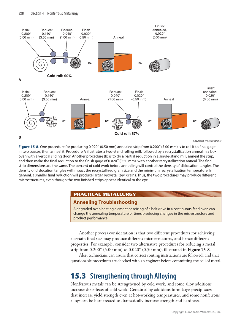 328 Section 4 Nonferrous Metallurgy Annealing Troubleshooting A degraded oven heating element or seizing of a belt drive in a continuous-feed oven can change the annealing temperature or time, producing changes in the microstructure and product performance. PRACTICAL METALLURGY PRACTICAL METALLURGY Another process consideration is that two different procedures for achieving a certain final size may produce different microstructures, and hence different properties. For example, consider two alternative procedures for reducing a metal strip from 0.200″ (5.00 mm) to 0.020″ (0.50 mm), illustrated in Figure 15-8. Alert technicians can assure that correct routing instructions are followed, and that questionable procedures are checked with an engineer before committing the coil of metal. 15.3 Strengthening through Alloying Nonfe rrous metals can be strengthened by cold work, and some alloy additions increase the effects of cold work. Certain alloy additions form large precipitates that increase yield strength even at hot-working temperatures, and some nonferrous alloys can be heat-treated to dramatically increase strength and hardness. Initial: 0.200” (5.00 mm) Reduce: 0.140” (3.56 mm) Reduce: 0.040” (1.00 mm) Cold roll: 90% Final: 0.020” (0.50 mm) Finish: annealed, 0.020” (0.50 mm) Anneal A Initial: 0.200” (5.00 mm) Reduce: 0.140” (3.56 mm) Reduce: 0.040” (1.00 mm) Final: 0.020” (0.50 mm) Finish: annealed, 0.020” (0.50 mm) Anneal Anneal Cold roll: 67% B Goodheart-Willcox Publisher Figure 15-8. One procedure for producing 0.020″ (0.50 mm) annealed strip from 0.200″ (5.00 mm) is to roll it to final gage in two passes, then anneal it. Procedure A illustrates a two-stand rolling mill, followed by a recrystallization anneal in a box oven with a vertical sliding door. Another procedure (B) is to do a partial reduction in a single-stand mill, anneal the strip, and then make the final reduction to the finish gage of 0.020″ (0.50 mm), with another recrystallization anneal. The final strip dimensions are the same. The percent of cold work before annealing will control the density of dislocation tangles. The density of dislocation tangles will impact the recrystallized grain size and the minimum recrystallization temperature. In general, a smaller final reduction will produce larger recrystallized grains. Thus, the two procedures may produce different microstructures, even though the two finished strips appear identical to the eye. Copyright Goodheart-Willcox Co., Inc.