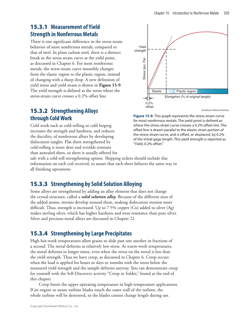 Chapter 15 Introduction to Nonferrous Metals 329 15.3.1 Measurement of Yield Strength in No nferrous Metals There is one significant difference in the stress-strain behavior of most nonferrous metals, compared to that of steel. In plain carbon steel, there is a distinct break in the stress-strain curve at the yield point, as discussed in Chapter 6. For most nonferrous metals, the stress-strain curve smoothly changes from the elastic region to the plastic region, instead of changing with a sharp drop. A new definition of yield stress and yield strain is shown in Figure 15-9. The yield strength is defined as the stress where the stress-strain curve crosses a 0.2% offset line. 15.3.2 Strengthening Alloys through Cold Work Cold work such as cold-rolling or cold forging increases the strength and hardness, and reduces the ductility, of nonferrous alloys by developing dislocation tangles. Flat sheet strengthened by cold-rolling is more dent and wrinkle resistant than annealed sheet, so sheet is usually offered for sale with a cold-roll strengthening option. Shipping tickets should include this information on each coil received, to assure that each sheet behaves the same way in all finishing operations. 15.3.3 Strengthening by Solid Solution Alloyi ng Some alloys are strengthened by adding an alloy element that does not change the crystal structure, called a solid solution alloy. Because of the different sizes of the added atoms, stresses develop around them, making dislocation motion more difficult. Thus, strength is increased. Up to 7.5% copper (Cu) added to silver (Ag) makes sterling silver, which has higher hardness and wear resistance than pure silver. Silver and precious metal alloys are discussed in Chapter 22. 15.3.4 Strengthening by Large Precipitates Hig h hot-work temperatures allow grains to slide past one another in fractions of a second. The metal deforms at relatively low stress. At warm-work temperatures, the metal deforms in longer times, even when the stress on the metal is less than the yield strength. Thus we have creep, as discussed in Chapter 6. Creep occurs when the load is applied for hours or days or months with the stress below the measured yield strength and the sample deforms anyway. You can demonstrate creep for yourself with the Self-Discovery activity “Creep in Solder,” found at the end of this chapter. Creep limits the upper operating temperature in high-temperature applications. If jet engine or steam turbine blades touch the outer wall of the turbine, the whole turbine will be destroyed, so the blades cannot change length during use. Yield strength 0.2% offset Stress (psi, Pa) Elongation (% of original length) Elastic Plastic region Goodheart-Willcox Publisher Figure 15-9. This graph represents the stress-strain curve for most nonferrous metals. The yield point is defined as where the stress-strain curve crosses a 0.2% offset line. The offset line is drawn parallel to the elastic strain portion of the stress-strain curve, and is offset, or displaced, by 0.2% of the initial gage length. This yield strength is reported as “Yield, 0.2% offset.” Copyright Goodheart-Willcox Co., Inc.