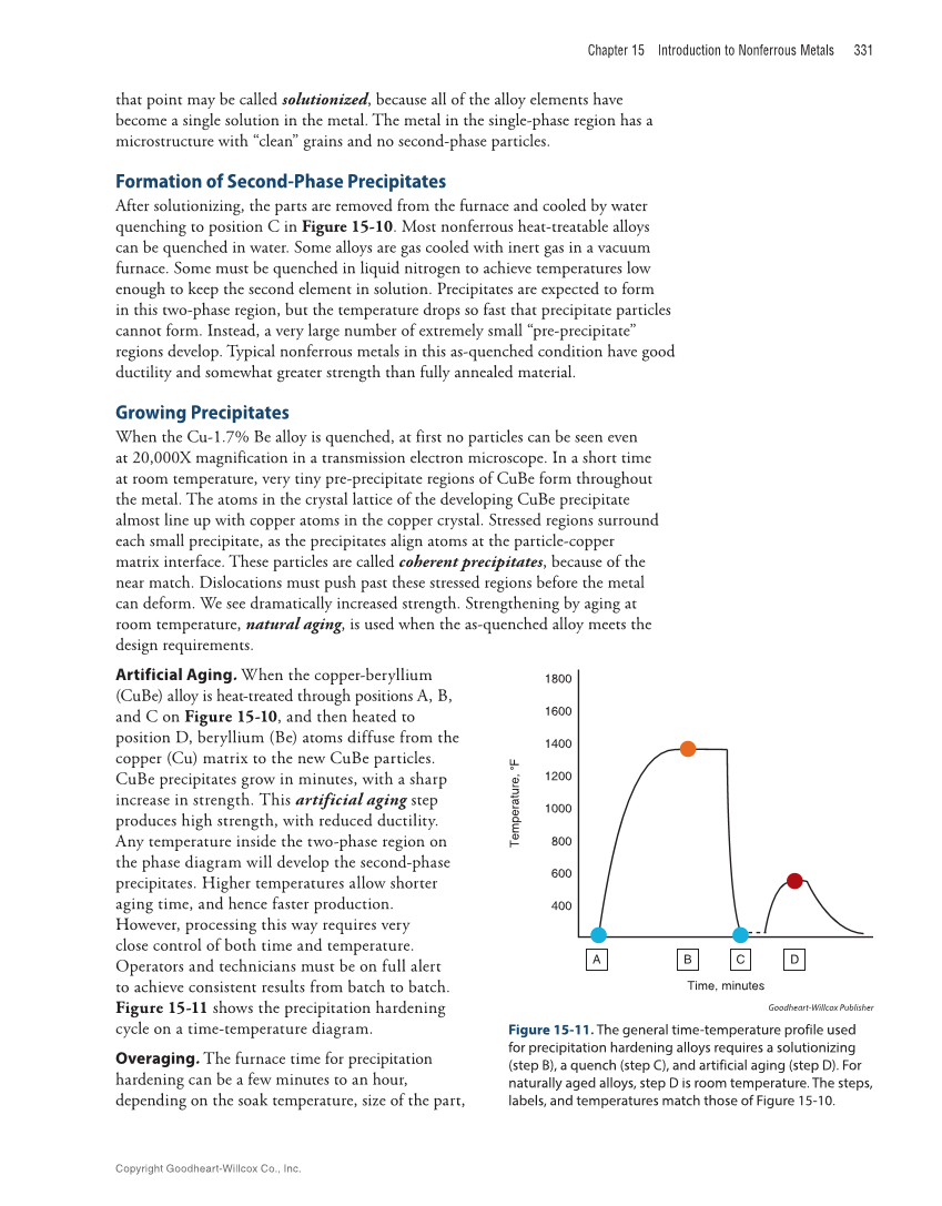 Chapter 15 Introduction to Nonferrous Metals 331 that point may be called solutionized, because all of the alloy elements have become a single solution in the metal. The metal in the single-phase region has a microstructure with “clean” grains and no second-phase particles. Formation of Second-Phase Precipitates After solutionizing, the parts are removed from the furnace and cooled by water quenching to position C in Figure 15-10. Most nonferrous heat-treatable alloys can be quenched in water. Some alloys are gas cooled with inert gas in a vacuum furnace. Some must be quenched in liquid nitrogen to achieve temperatures low enough to keep the second element in solution. Precipitates are expected to form in this two-phase region, but the temperature drops so fast that precipitate particles cannot form. Instead, a very large number of extremely small “pre-precipitate” regions develop. Typical nonferrous metals in this as-quenched condition have good ductility and somewhat greater strength than fully annealed material. Growing Precipitates When the Cu-1.7% Be alloy is quenched, at f irst no particles can be seen even at 20,000X magnification in a transmission electron microscope. In a short time at room temperature, very tiny pre-precipitate regions of CuBe form throughout the metal. The atoms in the crystal lattice of the developing CuBe precipitate almost line up with copper atoms in the copper crystal. Stressed regions surround each small precipitate, as the precipitates align atoms at the particle-copper matrix interface. These particles are called coherent precipitates, because of the near match. Dislocations must push past these stressed regions before the metal can deform. We see dramatically increased strength. Strengthening by aging at room temperature, natural aging, is used when the as-quenched alloy meets the design requirements. Artificial Aging. When the copper-beryllium (CuBe) alloy is heat -treated through positions A, B, and C on Figure 15-10, and then heated to position D, beryllium (Be) atoms diffuse from the copper (Cu) matrix to the new CuBe particles. CuBe precipitates grow in minutes, with a sharp increase in strength. This artificial aging step produces high strength, with reduced ductility. Any temperature inside the two-phase region on the phase diagram will develop the second-phase precipitates. Higher temperatures allow shorter aging time, and hence faster production. However, processing this way requires very close control of both time and temperature. Operators and technicians must be on full alert to achieve consistent results from batch to batch. Figure 15-11 shows the precipitation hardening cycle on a time-temperature diagram. Overaging. The furnace time for precipitation hardening can be a few minutes to an hour, depending on the soak temperature, size of the part, Goodheart-Willcox Publisher Figure 15-11. The general time-temperature profile used for precipitation hardening alloys requires a solutionizing (step B), a quench (step C), and artificial aging (step D). For naturally aged alloys, step D is room temperature. The steps, labels, and temperatures match those of Figure 15-10. 1800 1600 1400 1200 1000 Time, minutes Temperature, ° F 800 600 400 A B C D Copyright Goodheart-Willcox Co., Inc.