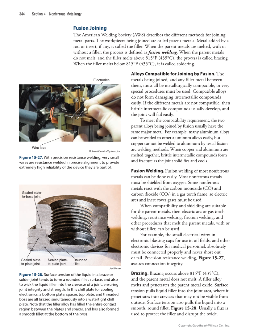 344 Section 4 Nonferrous Metallurgy Fusion Joining The American Welding Society (AWS) describes the different methods for joining metal parts. The workpieces being joined are called parent metals. Metal added by a rod or insert, if any, is called the filler. When the parent metals are melted, with or without a filler, the process is defined as fusion welding. When the parent metals do not melt, and the filler melts above 815°F (435°C), the process is called brazing. When the filler melts below 815°F (435°C), it is called soldering. Alloys Compatible for Joining by Fusion. The metals being joined, and any filler metal between them, must all be metallurgical ly compatible, or very special procedures must be used. Compatible alloys do not form damaging intermetallic compounds easily. If the different metals are not compatible, then brittle intermetallic compounds usually develop, and the joint will fail easily. To meet the compatibility requirement, the two parent alloys being joined by fusion usually have the same major metal. For example, many aluminum alloys can be welded to other aluminum alloys easily, but copper cannot be welded to aluminum by usual fusion arc welding methods. When copper and aluminum are melted together, brittle intermetallic compounds form and fracture as the joint solidifies and cools. Fusion Welding. Fusion welding of most nonferrous metals can be done easily. Most nonferrous metals must be shielded from oxyg en. Some nonferrous metals react with the carbon monoxide (CO) and carbon dioxide (CO2) in a gas torch flame, so electric arcs and inert cover gases must be used. When compatibility and shielding are suitable for the parent metals, then electric arc or gas torch welding, resistance welding, friction welding, and other procedures that melt the parent metals, with or without filler, can be used. For example, the small electrical wires in electronic blasting caps for use in oil fields, and other electronic devices for medical personnel, absolutely must be connected properly and never short out or fail. Precision resistance welding, Figure 15-27, assures connection integrity. Brazing. Brazing occurs above 815°F (435°C), and the parent metal does not melt. A filler alloy melts and penetrates the parent metal oxide. Surface tension pulls liquid filler into the joint area, where it penetrates into crevices that may not be visible from outside. Surface tension also pulls the liquid into a smooth, round fillet, Figure 15-28. Usually a flux is used to protect the filler and disrupt the oxide. Electrodes Wire lead Mohawk Electrical Systems, Inc. Figure 15-27. With precision resistance welding, very small wires are resistance welded in precise alignment to provide extremely high reliability of the device they are part of. Sealed plate- to-boss joint Sealed plate- to-plate joint Sealed plate- to-plate joint Rounded fillet Jay Warner Figure 15-28. Surface tension of the liquid in a braze or solder joint tends to form a rounded fillet surface, and also to wick the liquid filler into the crevasse of a joint, ensuring joint integrity and strength. In this chill plate for cooling electronics, a bottom plate, spacer, top plate, and threaded boss are all brazed simultaneously into a watertight chill plate. Note that the filler alloy has filled the entire contact region between the plates and spacer, and has also formed a smooth fillet at the bottom of the boss. Copyright Goodheart-Willcox Co., Inc.
