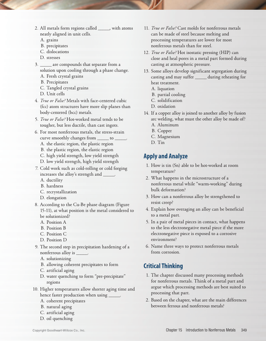 Chapter 15 Introduction to Nonferrous Metals 349 11. True or False? Cast molds for nonferrous metals can be made of steel because melting and processing temperatures are lower for most nonferrous metals than for steel. 12. True or False? Hot isostatic pressing (HIP) can close and heal pores in a metal part formed during casting at atmospheric pressure. 13. Some alloys develop significant segregation during casting and may suffer _____ during reheating for heat treatment. A. liquation B. partial cooling C. solidification D. oxidation 14. If a copper alloy is joined to another alloy by fusion arc welding, what must the other alloy be made of? A. Aluminum B. Copper C. Magnesium D. Tin Apply and Analyze 1. How is tin (Sn) able to be hot-worked at room temperature? 2. What happens in the microstructure of a nonferrous metal while “warm-working” during bulk deformation? 3. How can a nonferrous alloy be strengthened to resist creep? 4. Explain how overaging an alloy can be beneficial to a metal part. 5. In a pair of metal pieces in contact, what happens to the less electronegative metal piece if the more electronegative piece is exposed to a corrosive environment? 6. Name three ways to protect nonferrous metals from corrosion. Critical Thinking 1. The chapter discussed many processing methods for nonferrous metals. Think of a metal part and argue which processing methods are best suited to processing that part. 2. Based on the chapter, what are the main differences between ferrous and nonferrous metals? 2. All metals form regions called _____, with atoms neatly aligned in unit cells. A. grains B. precipitates C. dislocations D. stresses 3. _____ are compounds that separate from a solution upon cooling through a phase change. A. Fresh crystal grains B. Precipitates C. Tangled crystal grains D. Unit cells 4. True or False? Metals with face-centered cubic (fcc) atom structures have more slip planes than body-centered (bcc) metals. 5. True or False? Hot-worked metal tends to be tougher, but less ductile, than cast ingots. 6. For most nonferrous metals, the stress-strain curve smoothly changes from _____ to _____. A. the elastic region, the plastic region B. the plastic region, the elastic region C. high yield strength, low yield strength D. low yield strength, high yield strength 7. Cold work such as cold-rolling or cold forging increases the alloy’s strength and _____. A. ductility B. hardness C. recrystallization D. elongation 8. According to the Cu-Be phase diagram (Figure 15-11), at what position is the metal considered to be solutionized? A. Position A B. Position B C. Position C D. Position D 9. The second step in precipitation hardening of a nonferrous alloy is _____. A. solutionizing B. allowing coherent precipitates to form C. artificial aging D. water quenching to form “pre-precipitate” regions 10. Higher temperatures allow shorter aging time and hence faster production when using _____. A. coherent precipitates B. natural aging C. artificial aging D. oil quenching Copyright Goodheart-Willcox Co., Inc.