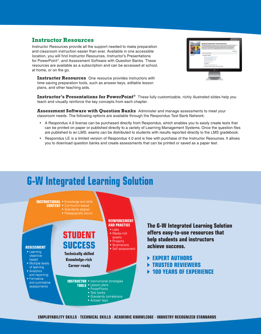 EMPLOYABILITY SKILLS ∙ TECHNICAL SKILLS ∙ ACADEMIC KNOWLEDGE ∙ INDUSTRY RECOGNIZED STANDARDS The G-W Integrated Learning Solution offers easy-to-use resources that help students and instructors achieve success. EXPERT AUTHORS TRUSTED REVIEWERS 100 YEARS OF EXPERIENCE G-W Integrated Learning Solution ASSESSMENT • Learning objective- based • Multiple levels of learning • Analytics and reporting • Formative and summative assessments • Knowledge and skills • Curriculum-based • Standards-aligned • Pedagogically sound INSTRUCTIONAL CONTENT INSTRUCTOR TOOLS • Instructional strategies • Lesson plans • PowerPoints • Test banks • Standards correlations • Answer keys REINFORCEMENT AND PRACTICE • Labs • Media-rich assets • Projects • Illustrations • Self-assessment STUDENT SUCCESS Technically skilled Knowledge-rich Career ready Instructor Resources Instructor Resources provide all the support needed to make preparation and classroom instruction easier than ever. Available in one accessible location, you will fi nd Instructor Resources, Instructor’s Presentations for PowerPoint®, and Assessment Software with Question Banks. These resources are available as a subscription and can be accessed at school, at home, or on the go. Instructor Resources One resource provides instructors with time-saving preparation tools, such as answer keys, editable lesson plans, and other teaching aids. Instructor’s Presentations for PowerPoint® These fully customizable, richly illustrated slides help you teach and visually reinforce the key concepts from each chapter. Assessment Software with Question Banks Administer and manage assessments to meet your classroom needs. The following options are available through the Respondus Test Bank Network: • A Respondus 4.0 license can be purchased directly from Respondus, which enables you to easily create tests that can be printed on paper or published directly to a variety of Learning Management Systems. Once the question fi les are published to an LMS, exams can be distributed to students with results reported directly to the LMS gradebook. • Respondus LE is a limited version of Respondus 4.0 and is free with purchase of the Instructor Resources. It allows you to download question banks and create assessments that can be printed or saved as a paper test.