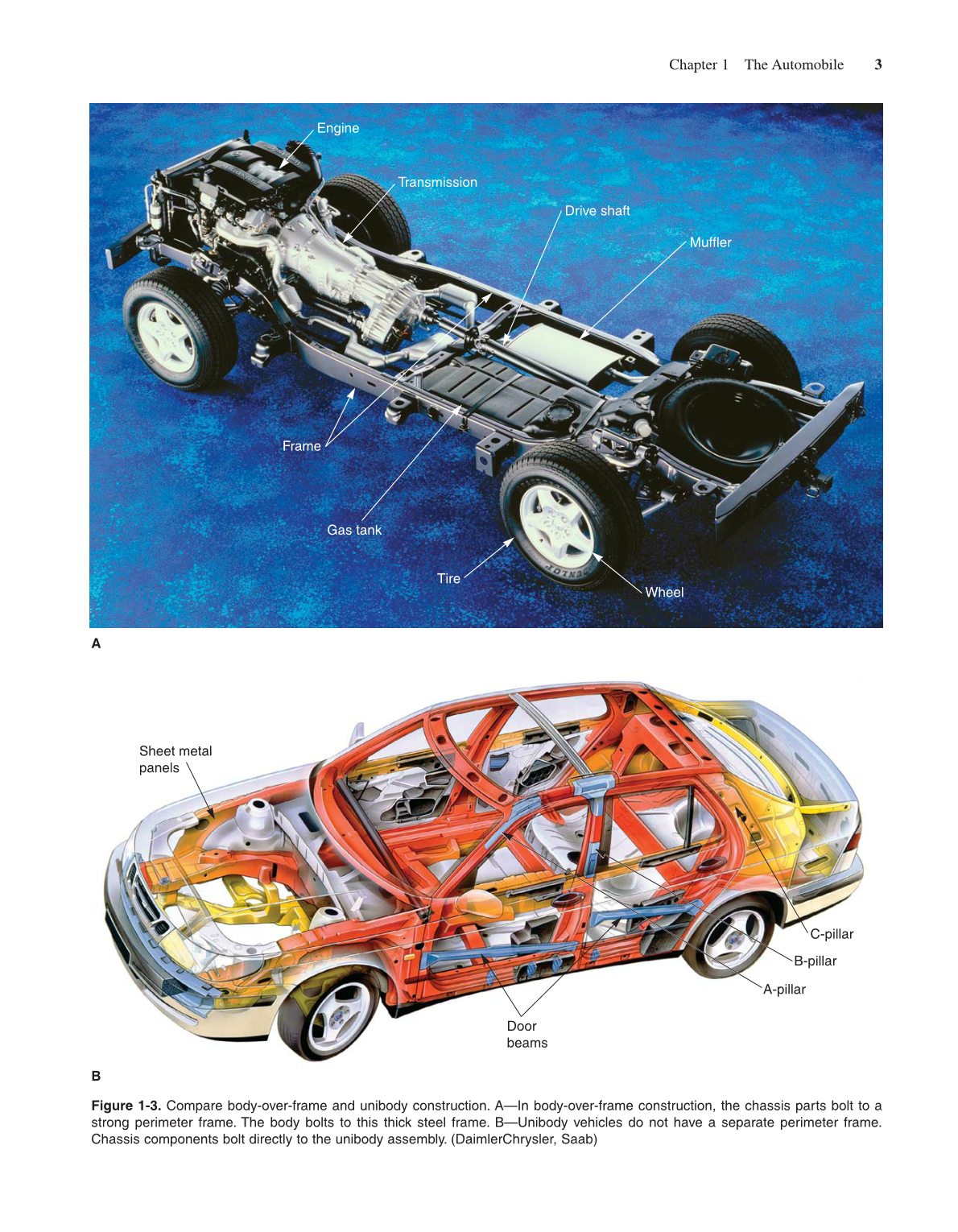 Figure 1-3. Compare body-over-frame and unibody construction. A—In body-over-frame construction, the chassis parts bolt to a