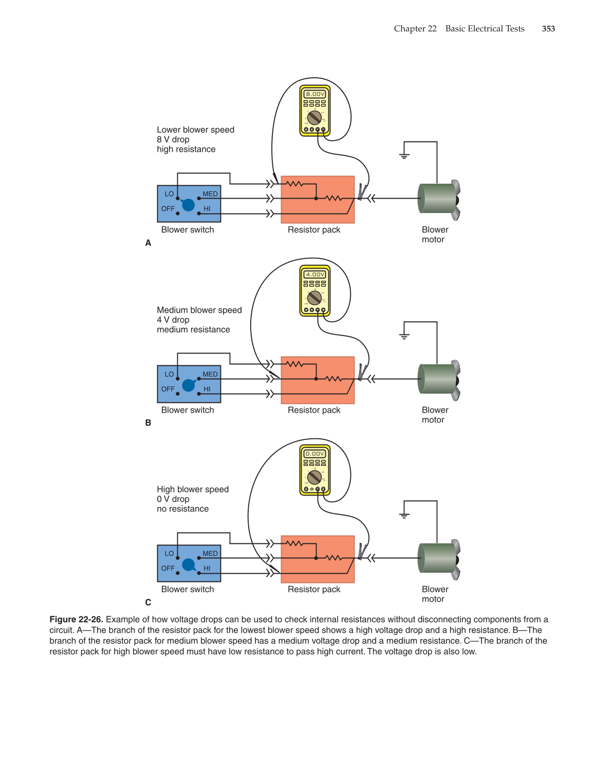 branch of the resistor pack for medium blower speed has a medium voltage drop and a medium resistance. C—The branch of the