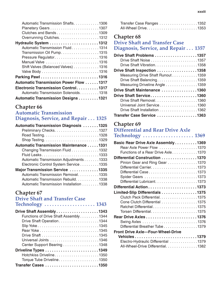 xxxiii Automatic Transmission Shafts. . . . . . . . . . . .1306 Planetary Gears . . . . . . . . . . . . . . . . . . . . . . .1307 Clutches and Bands . . . . . . . . . . . . . . . . . . . .1309 Overrunning Clutches. . . . . . . . . . . . . . . . . . . 1312 Hydraulic System . . . . . . . . . . . . . . . . . . . . . . 1312 Automatic Transmission Fluid. . . . . . . . . . . . . 1314 Transmission Oil Pump. . . . . . . . . . . . . . . . . . 1315 Pressure Regulator. . . . . . . . . . . . . . . . . . . . . 1316 Manual Valve . . . . . . . . . . . . . . . . . . . . . . . . . 1316 Shift Valves (Balanced Valves) . . . . . . . . . . . . 1316 Valve Body . . . . . . . . . . . . . . . . . . . . . . . . . . . 1316 Parking Pawl . . . . . . . . . . . . . . . . . . . . . . . . . . 1316 Automatic Transmission Power Flow . . . . . . 1317 Electronic Transmission Control. . . . . . . . . . 1317 Automatic Transmission Solenoids. . . . . . . . . 1318 Automatic Transmission Designs . . . . . . . . .1321 Chapter 66 Automatic Transmission Diagnosis, Service, and Repair . . . 1325 Automatic Transmission Diagnosis . . . . . . .1325 Preliminary Checks. . . . . . . . . . . . . . . . . . . . .1327 Road Testing. . . . . . . . . . . . . . . . . . . . . . . . . .1328 Shop Testing. . . . . . . . . . . . . . . . . . . . . . . . . .1329 Automatic Transmission Maintenance . . . . .1331 Changing Transmission Fluid . . . . . . . . . . . . .1332 Fluid Leaks. . . . . . . . . . . . . . . . . . . . . . . . . . .1333 Automatic Transmission Adjustments . . . . . . .1333 Electronic Control System Service . . . . . . . . .1335 Major Transmission Service . . . . . . . . . . . . .1335 Automatic Transmission Removal. . . . . . . . . .1335 Automatic Transmission Rebuild. . . . . . . . . . .1338 Automatic Transmission Installation . . . . . . . .1338 Chapter 67 Drive Shaft and Transfer Case Technology . . . . . . . . . . . . . . . . . . . . 1343 Drive Shaft Assembly . . . . . . . . . . . . . . . . . . .1343 Functions of Drive Shaft Assembly. . . . . . . . .1344 Drive Shaft Operation. . . . . . . . . . . . . . . . . . .1344 Slip Yoke. . . . . . . . . . . . . . . . . . . . . . . . . . . . .1345 Rear Yoke . . . . . . . . . . . . . . . . . . . . . . . . . . . .1345 Drive Shaft . . . . . . . . . . . . . . . . . . . . . . . . . . .1345 Universal Joints . . . . . . . . . . . . . . . . . . . . . . .1346 Center Support Bearing . . . . . . . . . . . . . . . . .1348 Driveline Types . . . . . . . . . . . . . . . . . . . . . . . .1349 Hotchkiss Driveline. . . . . . . . . . . . . . . . . . . . .1350 Torque Tube Driveline. . . . . . . . . . . . . . . . . . .1350 Transfer Cases . . . . . . . . . . . . . . . . . . . . . . . .1350 Transfer Case Ranges . . . . . . . . . . . . . . . . . .1352 All-Wheel Drive. . . . . . . . . . . . . . . . . . . . . . . .1353 Chapter 68 Drive Shaft and Transfer Case Diagnosis, Service, and Repair . . . 1357 Drive Shaft Problems . . . . . . . . . . . . . . . . . . .1357 Drive Shaft Noise . . . . . . . . . . . . . . . . . . . . . .1357 Drive Shaft Vibration. . . . . . . . . . . . . . . . . . . .1358 Drive Shaft Inspection . . . . . . . . . . . . . . . . . .1358 Measuring Drive Shaft Runout . . . . . . . . . . . .1359 Drive Shaft Balancing. . . . . . . . . . . . . . . . . . .1359 Measuring Driveline Angle . . . . . . . . . . . . . . .1359 Drive Shaft Maintenance . . . . . . . . . . . . . . . .1360 Drive Shaft Service. . . . . . . . . . . . . . . . . . . . .1360 Drive Shaft Removal. . . . . . . . . . . . . . . . . . . .1360 Universal Joint Service. . . . . . . . . . . . . . . . . .1360 Drive Shaft Installation . . . . . . . . . . . . . . . . . .1362 Transfer Case Service . . . . . . . . . . . . . . . . . .1363 Chapter 69 Differential and Rear Drive Axle Technology . . . . . . . . . . . . . . . . . . . . 1369 Basic Rear Drive Axle Assembly. . . . . . . . . .1369 Rear Axle Power Flow . . . . . . . . . . . . . . . . . .1370 Functions of a Rear Drive Axle. . . . . . . . . . . .1370 Differential Construction . . . . . . . . . . . . . . . .1370 Pinion Gear and Ring Gear . . . . . . . . . . . . . .1370 Differential Carrier. . . . . . . . . . . . . . . . . . . . . .1373 Differential Case . . . . . . . . . . . . . . . . . . . . . . .1373 Spider Gears . . . . . . . . . . . . . . . . . . . . . . . . .1373 Differential Lubricant. . . . . . . . . . . . . . . . . . . .1373 Differential Action. . . . . . . . . . . . . . . . . . . . . .1373 Limited-Slip Differentials . . . . . . . . . . . . . . . .1375 Clutch Pack Differential. . . . . . . . . . . . . . . . . .1375 Cone Clutch Differential . . . . . . . . . . . . . . . . .1375 Ratchet Differential . . . . . . . . . . . . . . . . . . . . .1375 Torsen Differential. . . . . . . . . . . . . . . . . . . . . .1375 Rear Drive Axles . . . . . . . . . . . . . . . . . . . . . . . 1376 Swing Axles . . . . . . . . . . . . . . . . . . . . . . . . . . 1376 Differential Breather Tube . . . . . . . . . . . . . . . .1379 Front Drive Axle—Four-Wheel-Drive Vehicles . . . . . . . . . . . . . . . . . . . . . . . . . . . .1379 Electro-Hydraulic Differential . . . . . . . . . . . . .1379 All-Wheel-Drive Differential. . . . . . . . . . . . . . .1382
