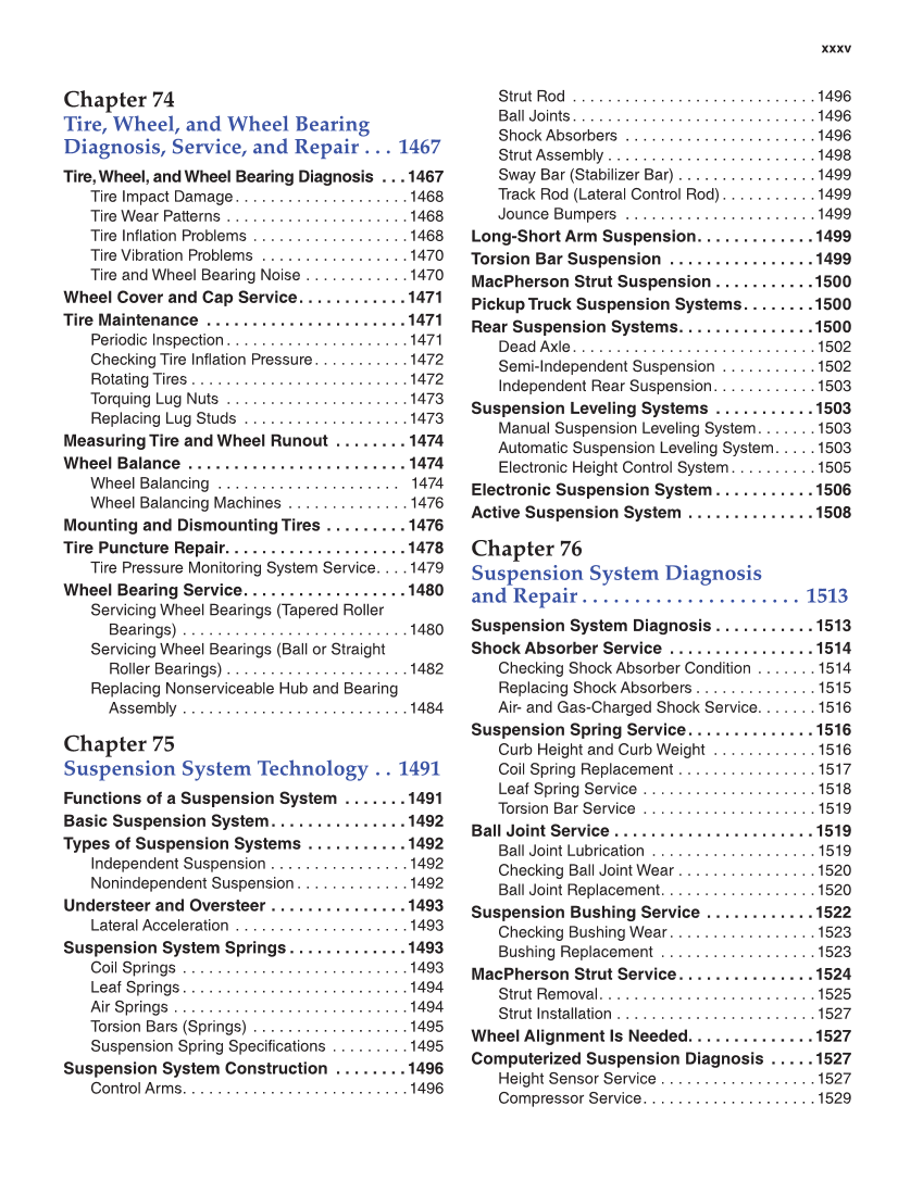 xxxv Chapter 74 Tire, Wheel, and Wheel Bearing Diagnosis, Service, and Repair . . . 1467 Tire, Wheel, and Wheel Bearing Diagnosis . . .1467 Tire Impact Damage. . . . . . . . . . . . . . . . . . . .1468 Tire Wear Patterns . . . . . . . . . . . . . . . . . . . . .1468 Tire Inflation Problems . . . . . . . . . . . . . . . . . .1468 Tire Vibration Problems . . . . . . . . . . . . . . . . .1470 Tire and Wheel Bearing Noise . . . . . . . . . . . .1470 Wheel Cover and Cap Service. . . . . . . . . . . .1471 Tire Maintenance . . . . . . . . . . . . . . . . . . . . . .1471 Periodic Inspection. . . . . . . . . . . . . . . . . . . . .1471 Checking Tire Inflation Pressure. . . . . . . . . . .1472 Rotating Tires . . . . . . . . . . . . . . . . . . . . . . . . .1472 Torquing Lug Nuts . . . . . . . . . . . . . . . . . . . . .1473 Replacing Lug Studs . . . . . . . . . . . . . . . . . . .1473 Measuring Tire and Wheel Runout . . . . . . . . 1474 Wheel Balance . . . . . . . . . . . . . . . . . . . . . . . . 1474 Wheel Balancing . . . . . . . . . . . . . . . . . . . . . 1474 Wheel Balancing Machines . . . . . . . . . . . . . . 1476 Mounting and Dismounting Tires . . . . . . . . . 1476 Tire Puncture Repair. . . . . . . . . . . . . . . . . . . .1478 Tire Pressure Monitoring System Service. . . .1479 Wheel Bearing Service. . . . . . . . . . . . . . . . . .1480 Servicing Wheel Bearings (Tapered Roller Bearings) . . . . . . . . . . . . . . . . . . . . . . . . . .1480 Servicing Wheel Bearings (Ball or Straight Roller Bearings) . . . . . . . . . . . . . . . . . . . . .1482 Replacing Nonserviceable Hub and Bearing Assembly . . . . . . . . . . . . . . . . . . . . . . . . . .1484 Chapter 75 Suspension System Technology . . 1491 Functions of a Suspension System . . . . . . .1491 Basic Suspension System. . . . . . . . . . . . . . .1492 Types of Suspension Systems . . . . . . . . . . .1492 Independent Suspension . . . . . . . . . . . . . . . .1492 Nonindependent Suspension . . . . . . . . . . . . .1492 Understeer and Oversteer . . . . . . . . . . . . . . .1493 Lateral Acceleration . . . . . . . . . . . . . . . . . . . .1493 Suspension System Springs . . . . . . . . . . . . .1493 Coil Springs . . . . . . . . . . . . . . . . . . . . . . . . . .1493 Leaf Springs. . . . . . . . . . . . . . . . . . . . . . . . . .1494 Air Springs . . . . . . . . . . . . . . . . . . . . . . . . . . .1494 Torsion Bars (Springs) . . . . . . . . . . . . . . . . . .1495 Suspension Spring Specifications . . . . . . . . .1495 Suspension System Construction . . . . . . . .1496 Control Arms. . . . . . . . . . . . . . . . . . . . . . . . . .1496 Strut Rod . . . . . . . . . . . . . . . . . . . . . . . . . . . .1496 Ball Joints. . . . . . . . . . . . . . . . . . . . . . . . . . . .1496 Shock Absorbers . . . . . . . . . . . . . . . . . . . . . .1496 Strut Assembly . . . . . . . . . . . . . . . . . . . . . . . .1498 Sway Bar (Stabilizer Bar) . . . . . . . . . . . . . . . .1499 Track Rod (Lateral Control Rod). . . . . . . . . . .1499 Jounce Bumpers . . . . . . . . . . . . . . . . . . . . . .1499 Long-Short Arm Suspension. . . . . . . . . . . . .1499 Torsion Bar Suspension . . . . . . . . . . . . . . . .1499 MacPherson Strut Suspension . . . . . . . . . . .1500 Pickup Truck Suspension Systems. . . . . . . .1500 Rear Suspension Systems. . . . . . . . . . . . . . .1500 Dead Axle. . . . . . . . . . . . . . . . . . . . . . . . . . . .1502 Semi-Independent Suspension . . . . . . . . . . .1502 Independent Rear Suspension. . . . . . . . . . . .1503 Suspension Leveling Systems . . . . . . . . . . .1503 Manual Suspension Leveling System. . . . . . .1503 Automatic Suspension Leveling System. . . . .1503 Electronic Height Control System. . . . . . . . . .1505 Electronic Suspension System . . . . . . . . . . .1506 Active Suspension System . . . . . . . . . . . . . .1508 Chapter 76 Suspension System Diagnosis and Repair . . . . . . . . . . . . . . . . . . . . . 1513 Suspension System Diagnosis . . . . . . . . . . . 1513 Shock Absorber Service . . . . . . . . . . . . . . . . 1514 Checking Shock Absorber Condition . . . . . . . 1514 Replacing Shock Absorbers . . . . . . . . . . . . . . 1515 Air- and Gas-Charged Shock Service. . . . . . . 1516 Suspension Spring Service. . . . . . . . . . . . . . 1516 Curb Height and Curb Weight . . . . . . . . . . . . 1516 Coil Spring Replacement . . . . . . . . . . . . . . . . 1517 Leaf Spring Service . . . . . . . . . . . . . . . . . . . . 1518 Torsion Bar Service . . . . . . . . . . . . . . . . . . . . 1519 Ball Joint Service . . . . . . . . . . . . . . . . . . . . . . 1519 Ball Joint Lubrication . . . . . . . . . . . . . . . . . . . 1519 Checking Ball Joint Wear . . . . . . . . . . . . . . . .1520 Ball Joint Replacement. . . . . . . . . . . . . . . . . .1520 Suspension Bushing Service . . . . . . . . . . . .1522 Checking Bushing Wear. . . . . . . . . . . . . . . . .1523 Bushing Replacement . . . . . . . . . . . . . . . . . .1523 MacPherson Strut Service. . . . . . . . . . . . . . .1524 Strut Removal. . . . . . . . . . . . . . . . . . . . . . . . .1525 Strut Installation . . . . . . . . . . . . . . . . . . . . . . .1527 Wheel Alignment Is Needed. . . . . . . . . . . . . .1527 Computerized Suspension Diagnosis . . . . .1527 Height Sensor Service . . . . . . . . . . . . . . . . . .1527 Compressor Service. . . . . . . . . . . . . . . . . . . .1529