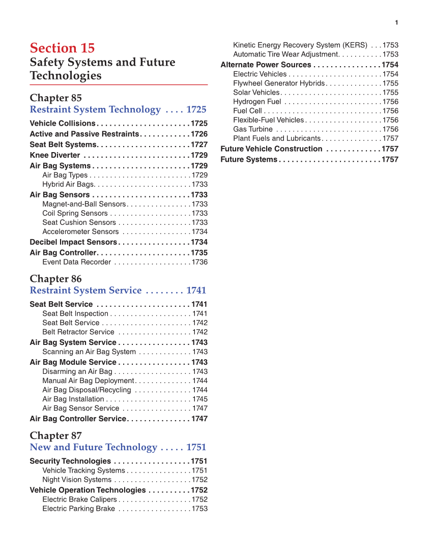 1 Section 15 Safety Systems and Future Technologies Chapter 85 Restraint System Technology . . . . 1725 Vehicle Collisions. . . . . . . . . . . . . . . . . . . . . .1725 Active and Passive Restraints. . . . . . . . . . . .1726 Seat Belt Systems. . . . . . . . . . . . . . . . . . . . . .1727 Knee Diverter . . . . . . . . . . . . . . . . . . . . . . . . .1729 Air Bag Systems . . . . . . . . . . . . . . . . . . . . . . .1729 Air Bag Types . . . . . . . . . . . . . . . . . . . . . . . . .1729 Hybrid Air Bags. . . . . . . . . . . . . . . . . . . . . . . .1733 Air Bag Sensors . . . . . . . . . . . . . . . . . . . . . . .1733 Magnet-and-Ball Sensors. . . . . . . . . . . . . . . .1733 Coil Spring Sensors . . . . . . . . . . . . . . . . . . . .1733 Seat Cushion Sensors . . . . . . . . . . . . . . . . . .1733 Accelerometer Sensors . . . . . . . . . . . . . . . . .1734 Decibel Impact Sensors. . . . . . . . . . . . . . . . .1734 Air Bag Controller. . . . . . . . . . . . . . . . . . . . . .1735 Event Data Recorder . . . . . . . . . . . . . . . . . . .1736 Chapter 86 Restraint System Service . . . . . . . . 1741 Seat Belt Service . . . . . . . . . . . . . . . . . . . . . . 1741 Seat Belt Inspection . . . . . . . . . . . . . . . . . . . . 1741 Seat Belt Service . . . . . . . . . . . . . . . . . . . . . . 1742 Belt Retractor Service . . . . . . . . . . . . . . . . . . 1742 Air Bag System Service . . . . . . . . . . . . . . . . . 1743 Scanning an Air Bag System . . . . . . . . . . . . . 1743 Air Bag Module Service . . . . . . . . . . . . . . . . . 1743 Disarming an Air Bag . . . . . . . . . . . . . . . . . . . 1743 Manual Air Bag Deployment. . . . . . . . . . . . . . 1744 Air Bag Disposal/Recycling . . . . . . . . . . . . . . 1744 Air Bag Installation . . . . . . . . . . . . . . . . . . . . . 1745 Air Bag Sensor Service . . . . . . . . . . . . . . . . . 1747 Air Bag Controller Service. . . . . . . . . . . . . . . 1747 Chapter 87 New and Future Technology . . . . . 1751 Security Technologies . . . . . . . . . . . . . . . . . .1751 Vehicle Tracking Systems . . . . . . . . . . . . . . . .1751 Night Vision Systems . . . . . . . . . . . . . . . . . . .1752 Vehicle Operation Technologies . . . . . . . . . .1752 Electric Brake Calipers . . . . . . . . . . . . . . . . . .1752 Electric Parking Brake . . . . . . . . . . . . . . . . . .1753 Kinetic Energy Recovery System (KERS) . . .1753 Automatic Tire Wear Adjustment. . . . . . . . . . .1753 Alternate Power Sources . . . . . . . . . . . . . . . .1754 Electric Vehicles . . . . . . . . . . . . . . . . . . . . . . .1754 Flywheel Generator Hybrids. . . . . . . . . . . . . .1755 Solar Vehicles. . . . . . . . . . . . . . . . . . . . . . . . .1755 Hydrogen Fuel . . . . . . . . . . . . . . . . . . . . . . . .1756 Fuel Cell . . . . . . . . . . . . . . . . . . . . . . . . . . . . .1756 Flexible-Fuel Vehicles. . . . . . . . . . . . . . . . . . .1756 Gas Turbine . . . . . . . . . . . . . . . . . . . . . . . . . .1756 Plant Fuels and Lubricants. . . . . . . . . . . . . . .1757 Future Vehicle Construction . . . . . . . . . . . . .1757 Future Systems. . . . . . . . . . . . . . . . . . . . . . . .1757 Feature Conten