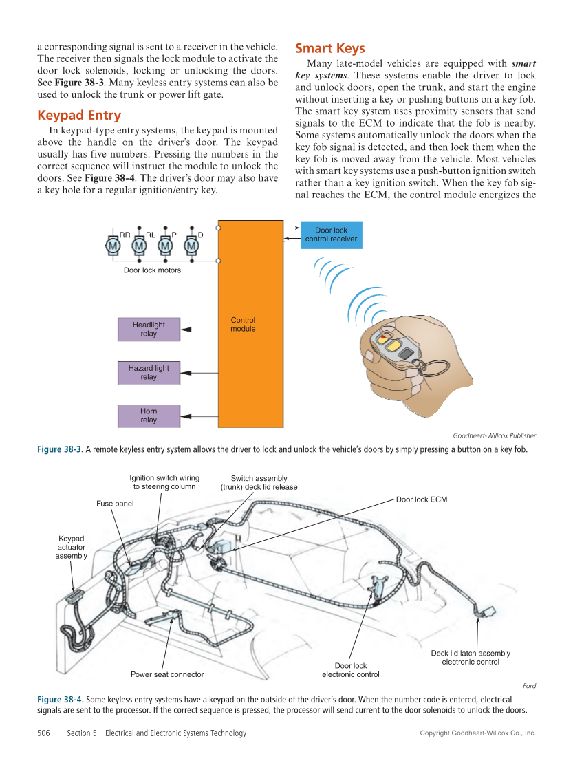 Copyright Goodheart-Willcox Co., Inc. 506 Section 5 Electrical and Electronic Systems Technology a corresponding signal is sent to a receiver in the vehicle. The receiver then signals the lock module to activate the door lock solenoids, locking or unlocking the doors. See Figure 38‑3. Many keyless entry systems can also be used to unlock the trunk or power lift gate. Keypad Entry In keypad-type entry systems, the keypad is mounted above the handle on the driver’s door. The keypad usually has five numbers. Pressing the numbers in the correct sequence will instruct the module to unlock the doors. See Figure 38‑4. The driver’s door may also have a key hole for a regular ignition/entry key. Smart Keys Many late-model vehicles are equipped with smart key systems. These systems enable the driver to lock and unlock doors, open the trunk, and start the engine without inserting a key or pushing buttons on a key fob. The smart key system uses proximity sensors that send signals to the ECM to indicate that the fob is nearby. Some systems automatically unlock the doors when the key fob signal is detected, and then lock them when the key fob is moved away from the vehicle. Most vehicles with smart key systems use a push-button ignition switch rather than a key ignition switch. When the key fob sig- nal reaches the ECM, the control module energizes the Headlight relay Hazard light relay Horn relay Control module Door lock motors RR RL P D Door lock control receiver Goodheart-Willcox Publisher Figure 38-3. A remote keyless entry system allows the driver to lock and unlock the vehicle’s doors by simply pressing a button on a key fob. Door lock electronic control Deck lid latch assembly electronic control Fuse panel Keypad actuator assembly Door lock ECM Ignition switch wiring to steering column Power seat connector Switch assembly (trunk) deck lid release Ford Figure 38-4. Some keyless entry systems have a keypad on the outside of the driver’s door. When the number code is entered, electrical signals are sent to the processor. If the correct sequence is pressed, the processor will send current to the door solenoids to unlock the doors.