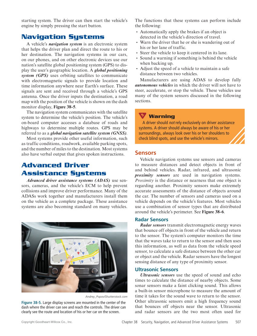 Chapter 38 Security, Navigation, and Advanced Driver Assistance Systems 507 Copyright Goodheart-Willcox Co., Inc. starting system. The driver can then start the vehicle’s engine by simply pressing the start button. Navigation Systems A vehicle’s navigation system is an electronic system that helps the driver plan and direct the route to his or her destination. The navigation systems in our cars, on our phones, and on other electronic devices use our nation’s satellite global positioning system (GPS) to dis- play the user’s geographic location. A global positioning system (GPS) uses orbiting satellites to communicate with electromagnetic signals to provide location and time information anywhere near Earth’s surface. These signals are sent and received through a vehicle’s GPS antenna. Once the driver inputs the destination, a road map with the position of the vehicle is shown on the dash monitor display, Figure 38‑5. The navigation system communicates with the satellite system to determine the vehicle’s position. The vehicle’s on-board computer accesses a database of roads and highways to determine multiple routes. GPS may be referred to as a global navigation satellite system (GNSS). Most systems provide other useful information, such as traffic conditions, roadwork, available parking spots, and the number of miles to the destination. Most systems also have verbal output that gives spoken instructions. Advanced Driver Assistance Systems Advanced driver assistance systems (ADAS) use sen- sors, cameras, and the vehicle’s ECM to help prevent collisions and improve driver performance. Many of the ADASs work together and manufacturers install them on the vehicle as a complete package. These assistance systems are also becoming standard on many vehicles. The functions that these systems can perform include the following: • Automatically apply the brakes if an object is detected in the vehicle’s direction of travel. • Warn the driver that he or she is wandering out of his or her lane of traffic. • Steer the vehicle to keep it centered in its lane. • Sound a warning if something is behind the vehicle when backing up. • Adjust the speed of a vehicle to maintain a safe distance between two vehicles. Manufacturers are using ADAS to develop fully autonomous vehicles in which the driver will not have to steer, accelerate, or stop the vehicle. These vehicles use many of the system sensors discussed in the following sections. Sensors Vehicle navigation systems use sensors and cameras to measure distances and detect objects in front of and behind vehicles. Radar, infrared, and ultrasonic proximity sensors are used in navigation systems. Proximity is the distance or nearness that one object is regarding another. Proximity sensors make extremely accurate assessments of the distance of objects around the car. The number of sensors and cameras used on a vehicle depends on the vehicle’s features. Most vehicles use a combination of sensor types that are distributed around the vehicle’s perimeter. See Figure 38‑6. Radar Sensors Radar sensors transmit electromagnetic energy waves that bounce off objects in front of the vehicle and return to the sensor. The system’s computer monitors the time that the waves take to return to the sensor and then uses this information, as well as data from the vehicle speed sensor, to calculate a safe distance between the other car or object and the vehicle. Radar sensors have the longest sensing distance of any type of proximity sensor. Ultrasonic Sensors Ultrasonic sensors use the speed of sound and echo times to calculate the distance of nearby objects. Some sonar sensors make a faint clicking sound. This allows a built-in sensor microphone to measure the amount of time it takes for the sound wave to return to the sensor. Other ultrasonic sensors emit a high frequency sound that bounces off objects near the sensor. Ultrasonic and radar sensors are the two most often used for Warning A driver should not rely exclusively on driver assistance systems. A driver should always be aware of his or her surroundings, always look over his or her shoulders to check blind spots, and use the vehicle’s mirrors. Andrey_Popov/Shutterstock.com Figure 38-5. Large display screens are mounted in the center of the dash where the driver can see and reach the controls. The driver can clearly see the route and location of his or her car on the screen.