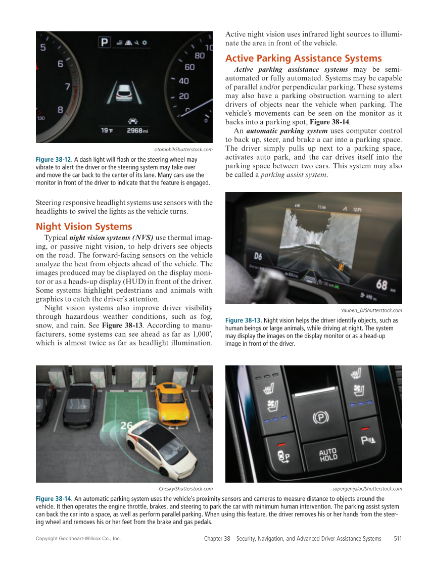 Chapter 38 Security, Navigation, and Advanced Driver Assistance Systems 511 Copyright Goodheart-Willcox Co., Inc. Steering responsive headlight systems use sensors with the headlights to swivel the lights as the vehicle turns. Night Vision Systems Typical night vision systems (NVS) use thermal imag- ing, or passive night vision, to help drivers see objects on the road. The forward-facing sensors on the vehicle analyze the heat from objects ahead of the vehicle. The images produced may be displayed on the display moni- tor or as a heads-up display (HUD) in front of the driver. Some systems highlight pedestrians and animals with graphics to catch the driver’s attention. Night vision systems also improve driver visibility through hazardous weather conditions, such as fog, snow, and rain. See Figure 38‑13. According to manu- facturers, some systems can see ahead as far as 1,000′, which is almost twice as far as headlight illumination. Active night vision uses infrared light sources to illumi- nate the area in front of the vehicle. Active Parking Assistance Systems Active parking assistance systems may be semi- automated or fully automated. Systems may be capable of parallel and/or perpendicular parking. These systems may also have a parking obstruction warning to alert drivers of objects near the vehicle when parking. The vehicle’s movements can be seen on the monitor as it backs into a parking spot, Figure 38‑14. An automatic parking system uses computer control to back up, steer, and brake a car into a parking space. The driver simply pulls up next to a parking space, activates auto park, and the car drives itself into the parking space between two cars. This system may also be called a parking assist system. otomobil/Shutterstock.com Figure 38-12. A dash light will flash or the steering wheel may vibrate to alert the driver or the steering system may take over and move the car back to the center of its lane. Many cars use the monitor in front of the driver to indicate that the feature is engaged. Yauhen_D/Shutterstock.com Figure 38-13. Night vision helps the driver identify objects, such as human beings or large animals, while driving at night. The system may display the images on the display monitor or as a head-up image in front of the driver. supergenijalac/Shutterstock.com Figure 38-14. An automatic parking system uses the vehicle’s proximity sensors and cameras to measure distance to objects around the vehicle. It then operates the engine throttle, brakes, and steering to park the car with minimum human intervention. The parking assist system can back the car into a space, as well as perform parallel parking. When using this feature, the driver removes his or her hands from the steer- ing wheel and removes his or her feet from the brake and gas pedals. Chesky/Shutterstock.com