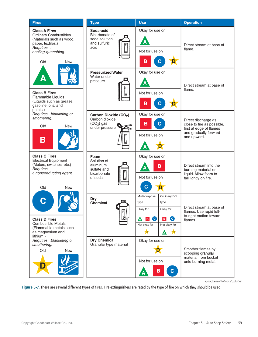 Chapter 5 Auto Shop Safety 59 Copyright Goodheart-Willcox Co., Inc. Fires Type Use Class A Fires Ordinary Combustibles (Materials such as wood, paper, textiles.) Requires... cooling-quenching. Class B Fires Flammable Liquids (Liquids such as grease, gasoline, oils, and paints.) Requires...blanketing or smothering. Class C Fires Electrical Equipment (Motors, switches, etc.) Requires... a nonconducting agent. Class D Fires Combustible Metals (Flammable metals such as magnesium and lithium.) Requires...blanketing or smothering. Soda-acid Bicarbonate of soda solution and sulfuric acid Pressurized Water Water under pressure Carbon Dioxide (CO2) Carbon dioxide (CO2) gas under pressure Foam Solution of aluminum sulfate and bicarbonate of soda Dry Chemical Dry Chemical Granular type material Not for use on Okay for use on Not okay for Not okay for Okay for Okay for Multi-purpose type Ordinary BC type Not for use on Not for use on Not for use on Not for use on Okay for use on Okay for use on Okay for use on Okay for use on Operation Direct stream at base of flame. Direct stream at base of flame. Direct discharge as close to fire as possible, first at edge of flames and gradually forward and upward. Direct stream into the burning material or liquid. Allow foam to fall lightly on fire. Direct stream at base of flames. Use rapid left- to-right motion toward flames. Smother flames by scooping granular material from bucket onto burning metal. A B C A A A A A B C D B B B B C C C C D D D D A D B C A D B C Old New Old New Old New D Old New Goodheart-Willcox Publisher Figure 5-7. There are several different types of fires. Fire extinguishers are rated by the type of fire on which they should be used.