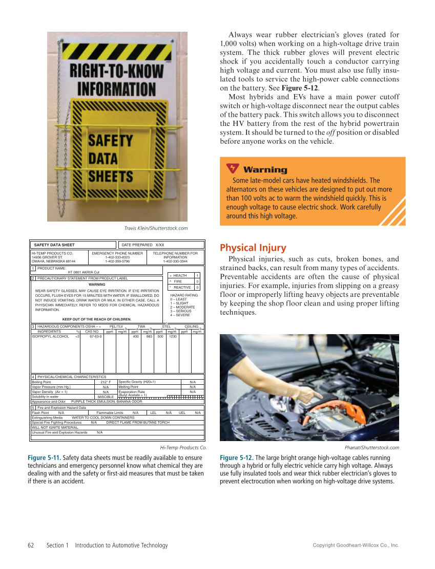 Copyright Goodheart-Willcox Co., Inc. 62 Section 1 Introduction to Automotive Technology Always wear rubber electrician’s gloves (rated for 1,000 volts) when working on a high-voltage drive train system. The thick rubber gloves will prevent electric shock if you accidentally touch a conductor carrying high voltage and current. You must also use fully insu- lated tools to service the high-power cable connections on the battery. See Figure 5‑12. Most hybrids and EVs have a main power cutoff switch or high-voltage disconnect near the output cables of the battery pack. This switch allows you to disconnect the HV battery from the rest of the hybrid powertrain system. It should be turned to the off position or disabled before anyone works on the vehicle. Physical Injury Physical injuries, such as cuts, broken bones, and strained backs, can result from many types of accidents. Preventable accidents are often the cause of physical injuries. For example, injuries from slipping on a greasy floor or improperly lifting heavy objects are preventable by keeping the shop floor clean and using proper lifting techniques. Warning Some late-model cars have heated windshields. The alternators on these vehicles are designed to put out more than 100 volts ac to warm the windshield quickly. This is enough voltage to cause electric shock. Work carefully around this high voltage. +HEALTH ^FIRE *REACTIVE 1 0 0 HAZARD RATING 0 – LEAST 1 – SLIGHT 2 – MODERATE 3 – SERIOUS 4 – SEVERE PRODUCT NAME: HT 0801 AKRYA Cut 1 2 PRECAUTIONARY STATEMENT FROM PRODUCT LABEL WEAR SAFETY GLASSES. MAY CAUSE EYE IRRITATION. IF EYE IRRITATION OCCURS, FLUSH EYES FOR 15 MINUTES WITH WATER. IF SWALLOWED, DO NOT INDUCE VOMITING. DRINK WATER OR MILK. IN EITHER CASE, CALL A PHYSICIAN IMMEDIATELY. REFER TO MSDS FOR CHEMICAL HAZARDOUS INFORMATION. WARNING KEEP OUT OF THE REACH OF CHILDREN. 3 HAZARDOUS COMPONENTS OSHA – PEL/TLV TWA CEILING STEL c INGREDIENTS %CAS NO. ISOPROPYL ALCOHOL 3 67-63-0 a ppm 3 mg/m a ppm 3 mg/m a ppm 3 mg/m a ppm 3 mg/m 400 983 500 1230 SAFETY DATA SHEET DATE PREPARED X/XX HI-TEMP PRODUCTS CO. 14936 GROVER ST. OMAHA, NEBRASKA 68144 EMERGENCY PHONE NUMBER 1-402-333-8323 1-402-359-5796 TELEPHONE NUMBER FOR INFORMATION 1-402-330-3344 4 PHYSICAL/CHEMICAL CHARACTERISTICS Boiling Point Vapor Pressure (mm Hg.) Vapor Density (Air =1) Solubility in water Appearance and Odor PURPLE THICK EMULSION, BANANA ODOR Specific Gravity (H20=1) Melting Point Evaporation Rate (Butyl Acetate =1) 212 F N/A N/A MISCIBLE ° N/A N/A N/A 5 Fire and Explosion Hazard Data Flash Point N/A Flammable Limits N/A LEL N/A UEL N/A Extinguishing Media WATER TO COOL DOWN CONTAINERS Special Fire Fighting Procedures N/A DIRECT FLAME FROM BUTANE TORCH WILL NOT IGNITE MATERIAL. Unusual Fire and Explosion Hazards N/A Hi-Temp Products Co. Figure 5-11. Safety data sheets must be readily available to ensure technicians and emergency personnel know what chemical they are dealing with and the safety or first-aid measures that must be taken if there is an accident. Travis Klein/Shutterstock.com Phanat/Shutterstock.com Figure 5-12. The large bright orange high-voltage cables running through a hybrid or fully electric vehicle carry high voltage. Always use fully insulated tools and wear thick rubber electrician’s gloves to prevent electrocution when working on high-voltage drive systems.