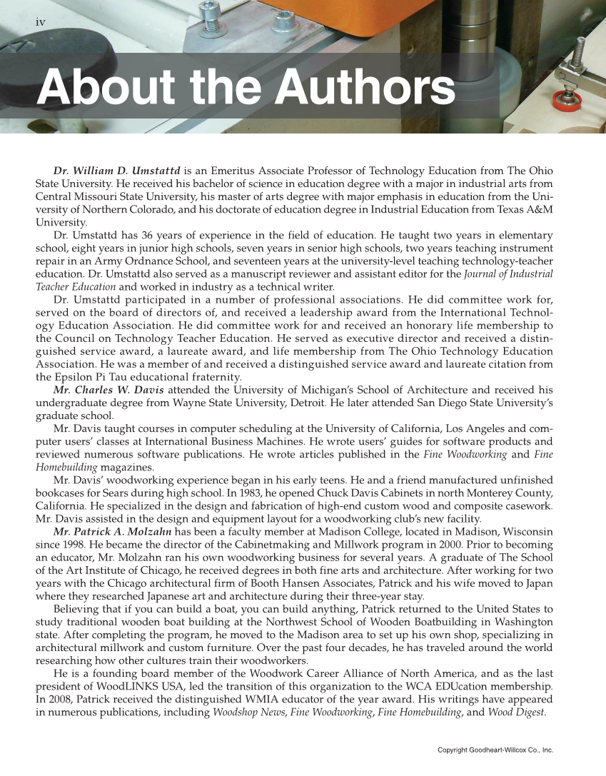 Dr. William D. Umstattd is an Emeritus Associate Professor of Technology Education from The Ohio State University. He received his bachelor of science in education degree with a major in industrial arts from Central Missouri State University, his master of arts degree with major emphasis in education from the Uni- versity of Northern Colorado, and his doctorate of education degree in Industrial Education from Texas A&M University. Dr. Umstattd has 36 years of experience in the field of education. He taught two years in elementary school, eight years in junior high schools, seven years in senior high schools, two years teaching instrument repair in an Army Ordnance School, and seventeen years at the university-level teaching technology-teacher education. Dr. Umstattd also served as a manuscript reviewer and assistant editor for the Journal of Industrial Teacher Education and worked in industry as a technical writer. Dr. Umstattd participated in a number of professional associations. He did committee work for, served on the board of directors of, and received a leadership award from the International Technol- ogy Education Association. He did committee work for and received an honorary life membership to the Council on Technology Teacher Education. He served as executive director and received a distin- guished service award, a laureate award, and life membership from The Ohio Technology Education Association. He was a member of and received a distinguished service award and laureate citation from the Epsilon Pi Tau educational fraternity. Mr. Charles W. Davis attended the University of Michigan’s School of Architecture and received his undergraduate degree from Wayne State University, Detroit. He later attended San Diego State University’s graduate school. Mr. Davis taught courses in computer scheduling at the University of California, Los Angeles and com- puter users’ classes at International Business Machines. He wrote users’ guides for software products and reviewed numerous software publications. He wrote articles published in the Fine Woodworking and Fine Homebuilding magazines. Mr. Davis’ woodworking experience began in his early teens. He and a friend manufactured unfinished bookcases for Sears during high school. In 1983, he opened Chuck Davis Cabinets in north Monterey County, California. He specialized in the design and fabrication of high-end custom wood and composite casework. Mr. Davis assisted in the design and equipment layout for a woodworking club’s new facility. Mr. Patrick A. Molzahn has been a faculty member at Madison College, located in Madison, Wisconsin since 1998. He became the director of the Cabinetmaking and Millwork program in 2000. Prior to becoming an educator, Mr. Molzahn ran his own woodworking business for several years. A graduate of The School of the Art Institute of Chicago, he received degrees in both fine arts and architecture. After working for two years with the Chicago architectural firm of Booth Hansen Associates, Patrick and his wife moved to Japan where they researched Japanese art and architecture during their three-year stay. Believing that if you can build a boat, you can build anything, Patrick returned to the United States to study traditional wooden boat building at the Northwest School of Wooden Boatbuilding in Washington state. After completing the program, he moved to the Madison area to set up his own shop, specializing in architectural millwork and custom furniture. Over the past four decades, he has traveled around the world researching how other cultures train their woodworkers. He is a founding board member of the Woodwork Career Alliance of North America, and as the last president of WoodLINKS USA, led the transition of this organization to the WCA EDUcation membership. In 2008, Patrick received the distinguished WMIA educator of the year award. His writings have appeared in numerous publications, including Woodshop News, Fine Woodworking, Fine Homebuilding, and Wood Digest. About the Authors Copyright Goodheart-Willcox Co., Inc. iv