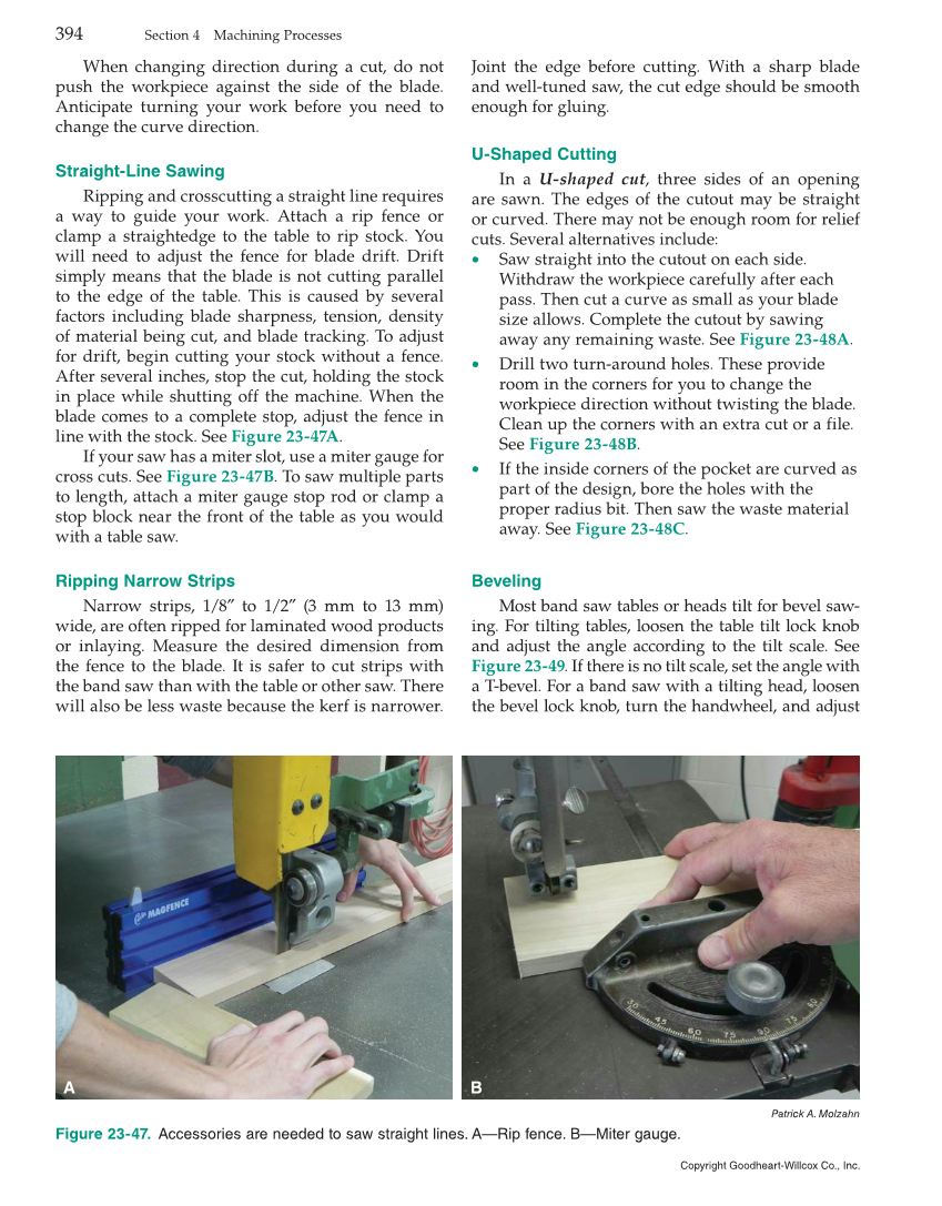 When changing direction during a cut, do not push the workpiece against the side of the blade. Anticipate turning your work before you need to change the curve direction. Straight-Line Sawing Ripping and crosscutting a straight line requires a way to guide your work. Attach a rip fence or clamp a straightedge to the table to rip stock. You will need to adjust the fence for blade drift. Drift simply means that the blade is not cutting parallel to the edge of the table. This is caused by several factors including blade sharpness, tension, density of material being cut, and blade tracking. To adjust for drift, begin cutting your stock without a fence. After several inches, stop the cut, holding the stock in place while shutting off the machine. When the blade comes to a complete stop, adjust the fence in line with the stock. See Figure 23-47A. If your saw has a miter slot, use a miter gauge for cross cuts. See Figure 23-47B. To saw multiple parts to length, attach a miter gauge stop rod or clamp a stop block near the front of the table as you would with a table saw. Ripping Narrow Strips Narrow strips, 1/8″ to 1/2″ (3 mm to 13 mm) wide, are often ripped for laminated wood products or inlaying. Measure the desired dimension from the fence to the blade. It is safer to cut strips with the band saw than with the table or other saw. There will also be less waste because the kerf is narrower. Joint the edge before cutting. With a sharp blade and well-tuned saw, the cut edge should be smooth enough for gluing. U-Shaped Cutting In a U-shaped cut, three sides of an opening are sawn. The edges of the cutout may be straight or curved. There may not be enough room for relief cuts. Several alternatives include: • Saw straight into the cutout on each side. Withdraw the workpiece carefully after each pass. Then cut a curve as small as your blade size allows. Complete the cutout by sawing away any remaining waste. See Figure 23-48A. • Drill two turn-around holes. These provide room in the corners for you to change the workpiece direction without twisting the blade. Clean up the corners with an extra cut or a file. See Figure 23-48B. • If the inside corners of the pocket are curved as part of the design, bore the holes with the proper radius bit. Then saw the waste material away. See Figure 23-48C. Beveling Most band saw tables or heads tilt for bevel saw- ing. For tilting tables, loosen the table tilt lock knob and adjust the angle according to the tilt scale. See Figure 23-49. If there is no tilt scale, set the angle with a T-bevel. For a band saw with a tilting head, loosen the bevel lock knob, turn the handwheel, and adjust Patrick A. Molzahn Figure 23-47. Accessories are needed to saw straight lines. A—Rip fence. B—Miter gauge. A B 394 Section 4 Machining Processes Copyright Goodheart-Willcox Co., Inc.
