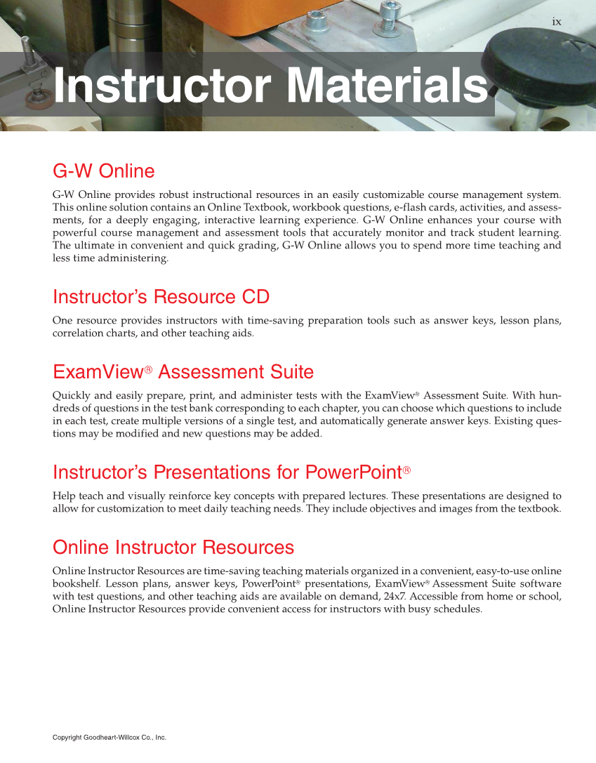 G-W Online G-W Online provides robust instructional resources in an easily customizable course management system. This online solution contains an Online Textbook, workbook questions, e-flash cards, activities, and assess- ments, for a deeply engaging, interactive learning experience. G-W Online enhances your course with powerful course management and assessment tools that accurately monitor and track student learning. The ultimate in convenient and quick grading, G-W Online allows you to spend more time teaching and less time administering. Instructor’s Resource CD One resource provides instructors with time-saving preparation tools such as answer keys, lesson plans, correlation charts, and other teaching aids. ExamView® Assessment Suite Quickly and easily prepare, print, and administer tests with the ExamView® Assessment Suite. With hun- dreds of questions in the test bank corresponding to each chapter, you can choose which questions to include in each test, create multiple versions of a single test, and automatically generate answer keys. Existing ques- tions may be modified and new questions may be added. Instructor’s Presentations for PowerPoint® Help teach and visually reinforce key concepts with prepared lectures. These presentations are designed to allow for customization to meet daily teaching needs. They include objectives and images from the textbook. Online Instructor Resources Online Instructor Resources are time-saving teaching materials organized in a convenient, easy-to-use online bookshelf. Lesson plans, answer keys, PowerPoint® presentations, ExamView® Assessment Suite software with test questions, and other teaching aids are available on demand, 24x7. Accessible from home or school, Online Instructor Resources provide convenient access for instructors with busy schedules. Instructor Materials Copyright Goodheart-Willcox Co., Inc. ix